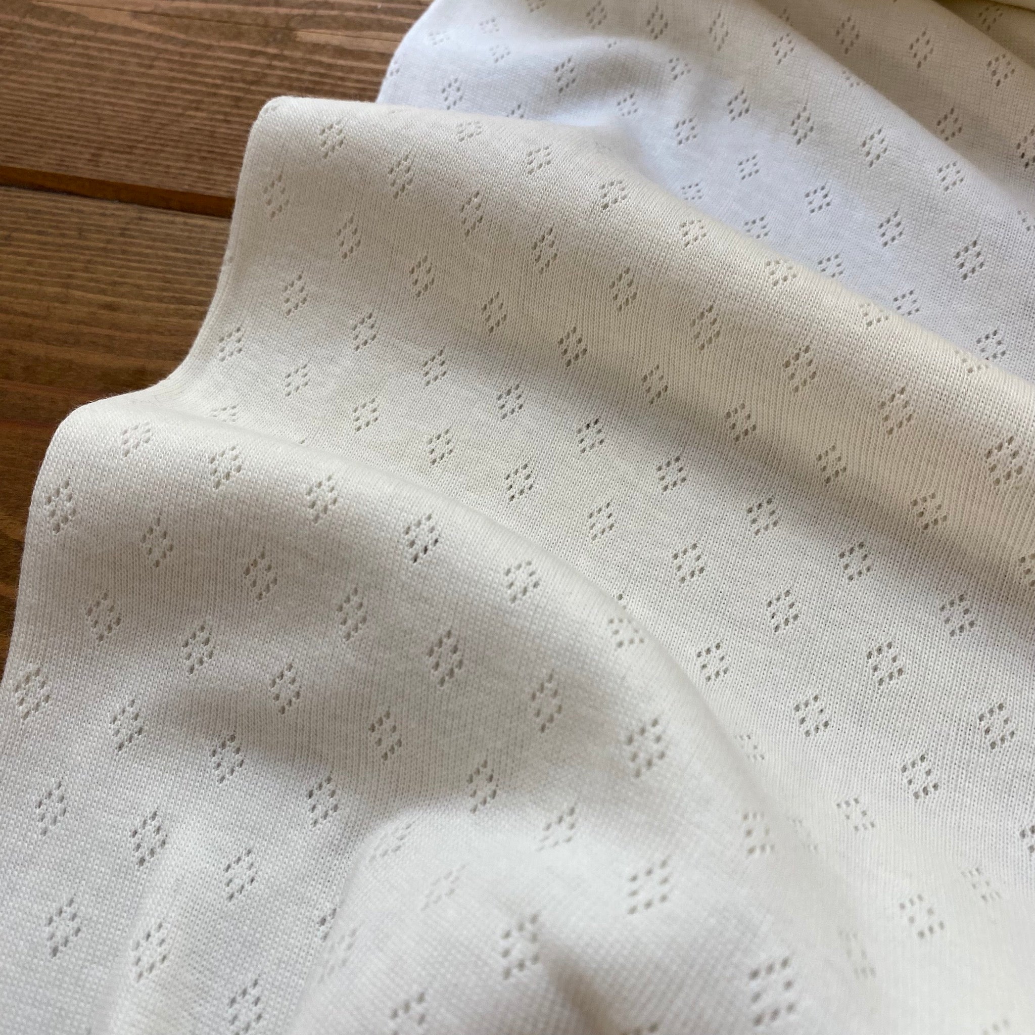 Pointelle is a soft, lightweight jersey with delicate openwork details (think tiny eyelets or lace-like patterns) woven right in. It has a gentle stretch and beautiful drape, making it perfect for layering pieces, lounge sets, babywear, or easygoing everyday tops.