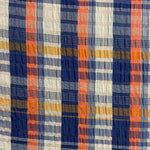 Experience the lightweight comfort of Suzie Check Seersucker. Made from crinkle cotton, this fabric boasts a unique texture that adds dimension to the overlaid blues and orange color scheme. Perfect for warm weather, this fabric provides both style and breathability.