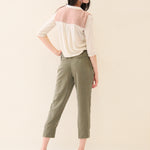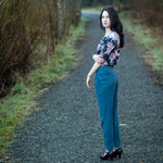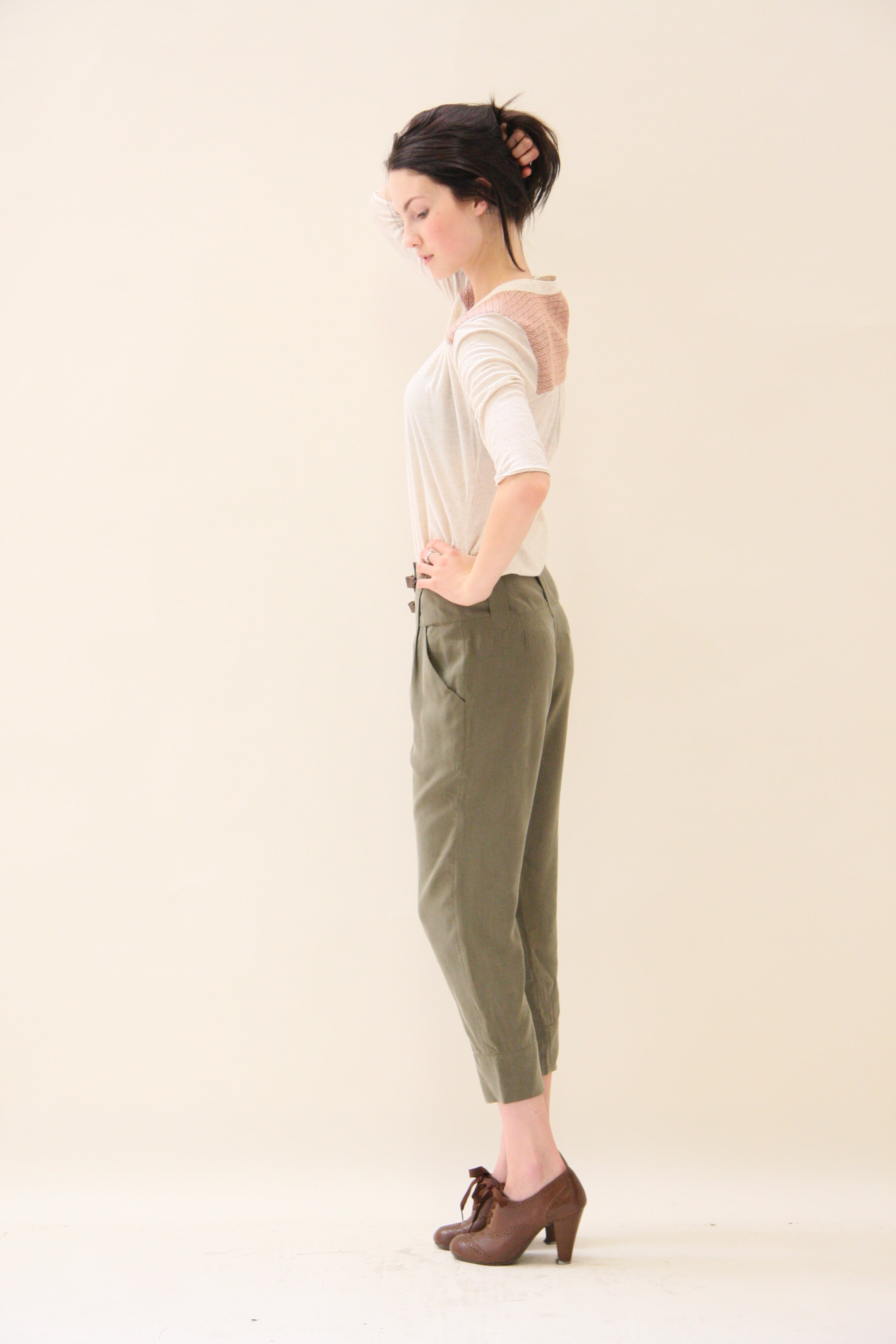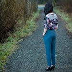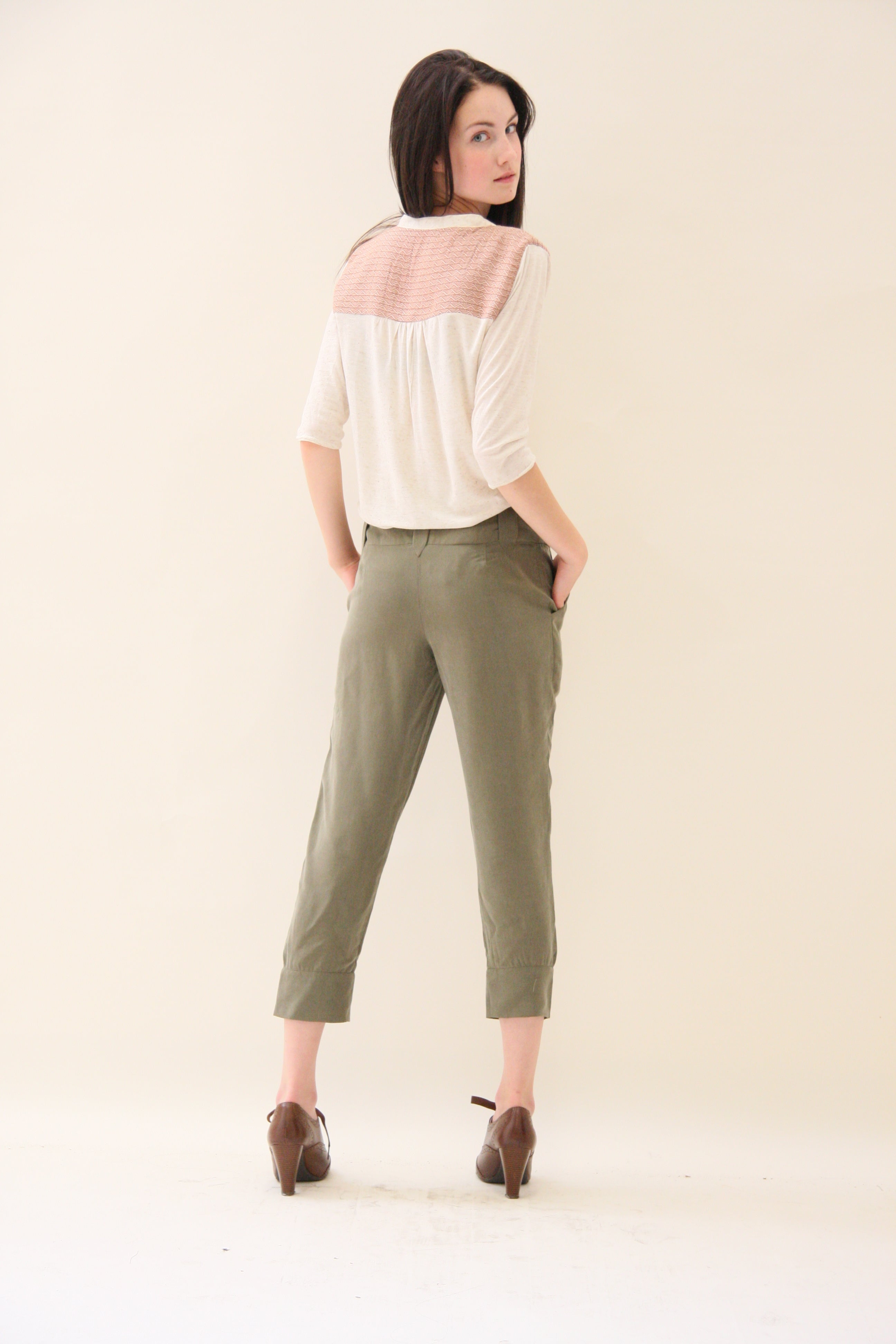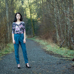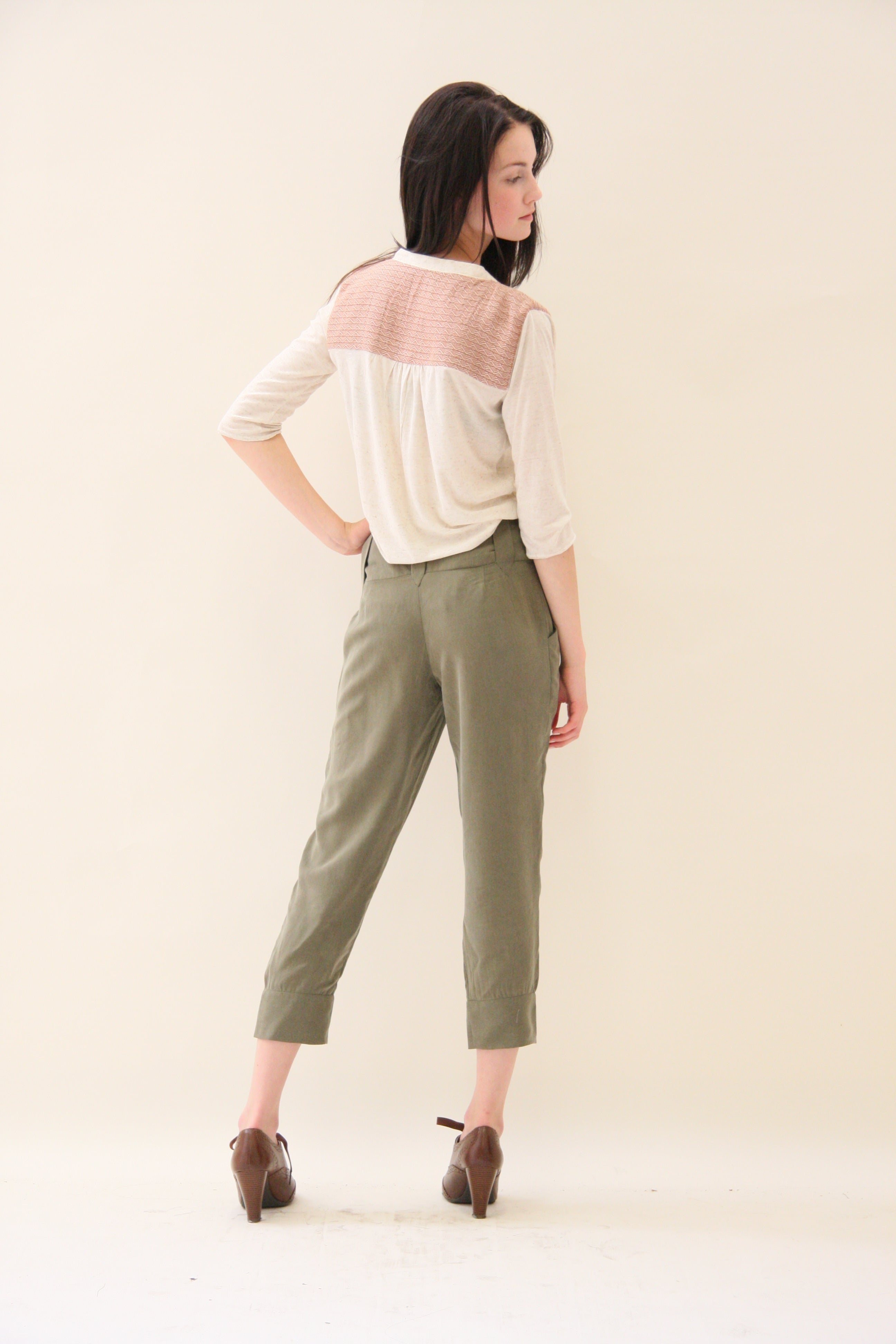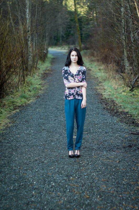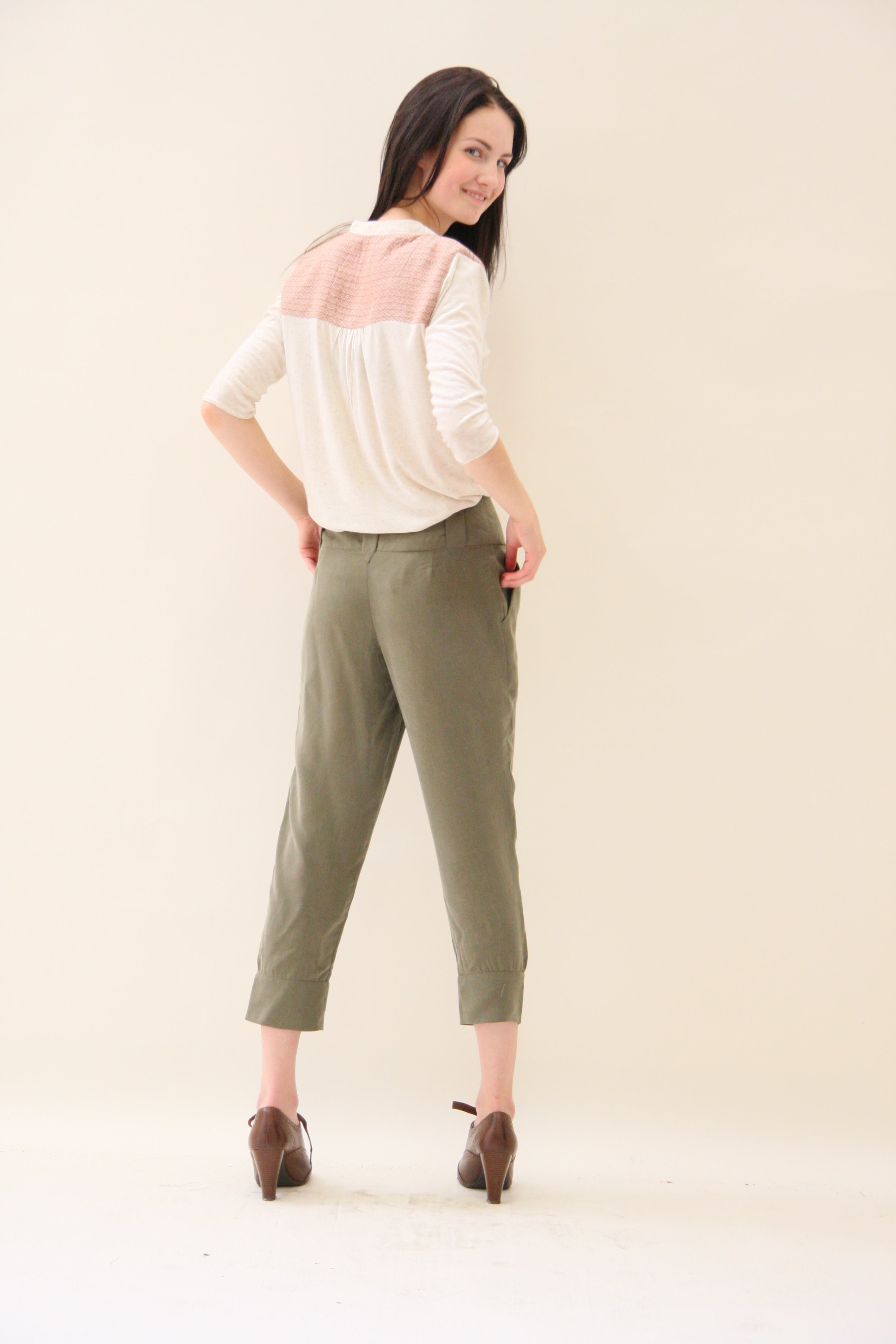 The gathers create a flattering shape that is loose enough to float over the body rather than cling to it.  The delicately curved hem can be tucked into trousers and skirts or can be left loose to float over skinny jeans.  The slim sleeves end just below the elbow to create the perfect multi-season blouse.  Instructions detail how to create a variety of closures - learn how to add buttonholes to a knit placket, add snaps or create a pull over blouse and skip button holes entirely.  Fabric requirements are included for both a color blocked blouse and a blouse made from one fabric.