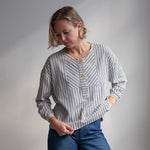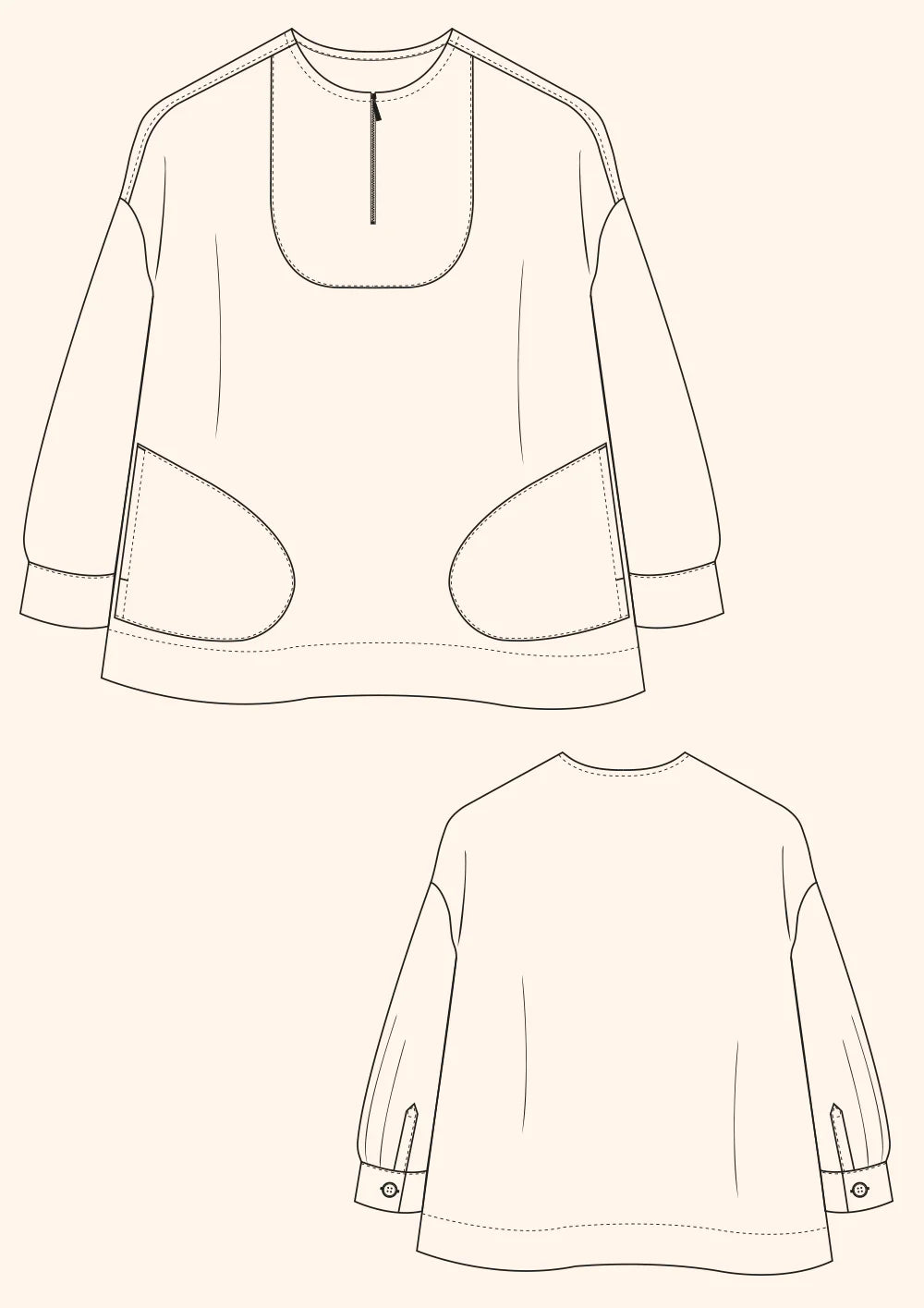 The French Smock is a casual classic that comes with a huge range of design options which include: a button up placket OR zip fastening, different bib shapes, an optional trim for the curved bib, optional patch pockets, 2 different lengths and options for thick or thin fabrics for the cuff, sleeve placket and neck binding (thin fabrics can use the smaller pattern pieces, thicker fabrics will want to use the wider pattern pieces.