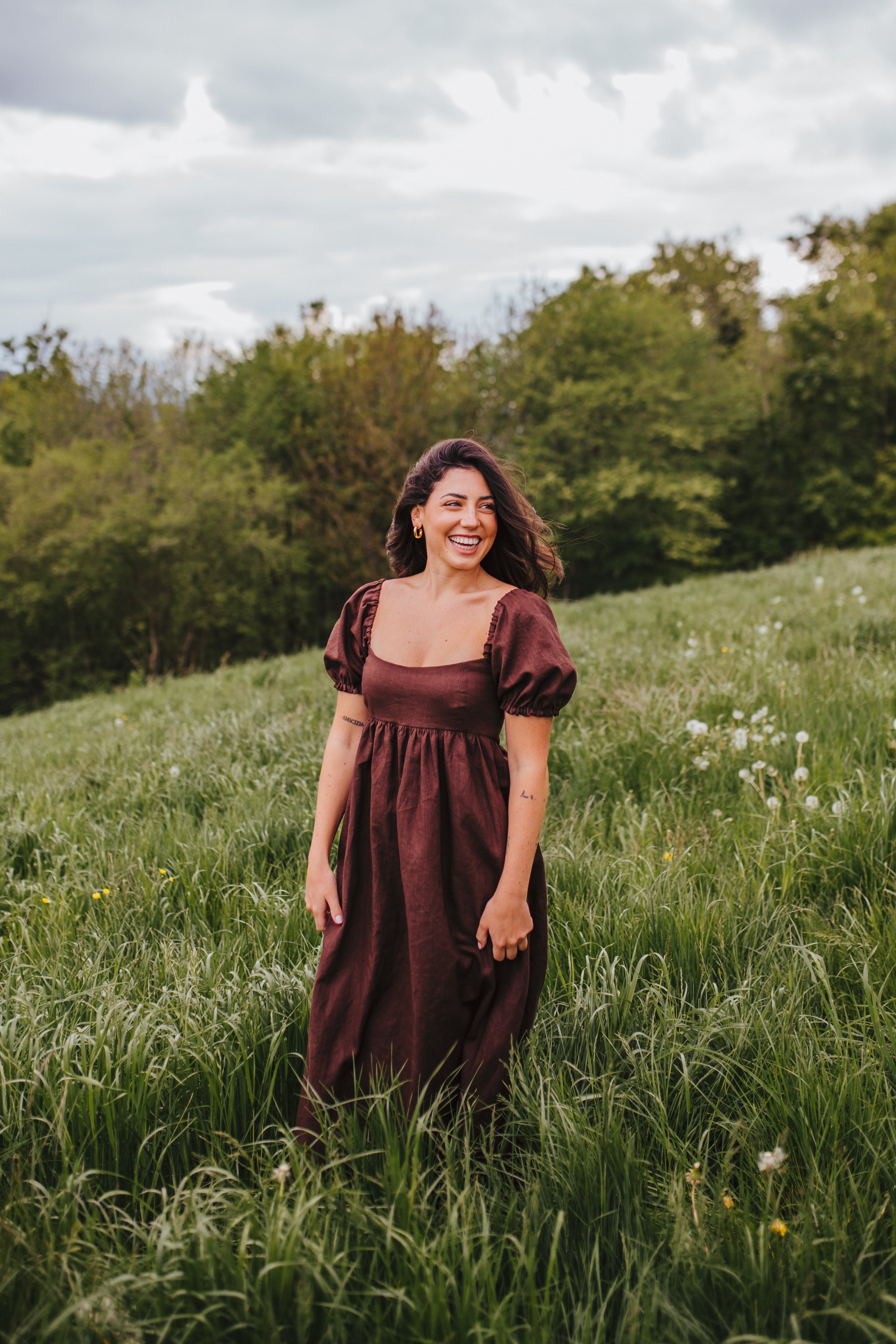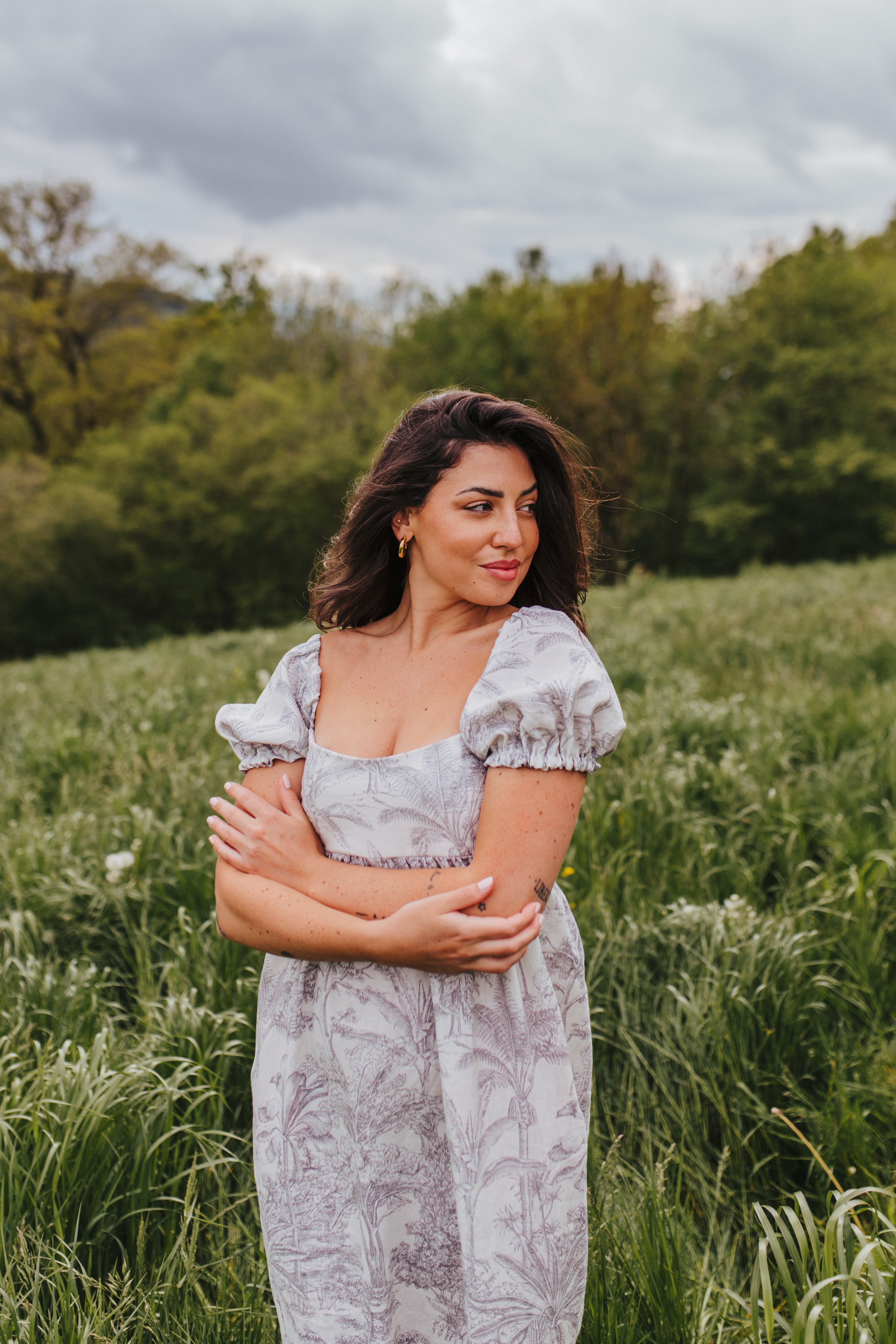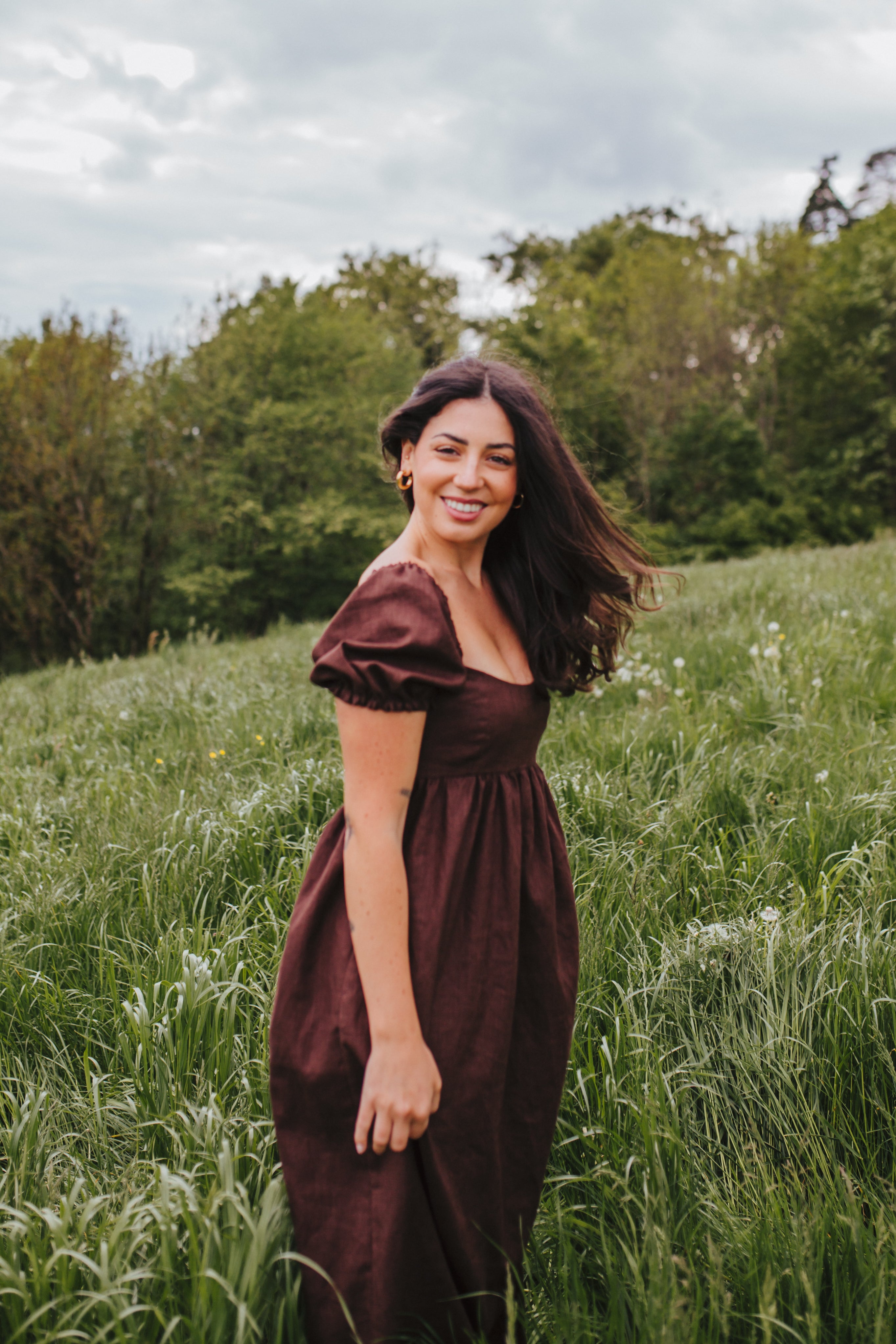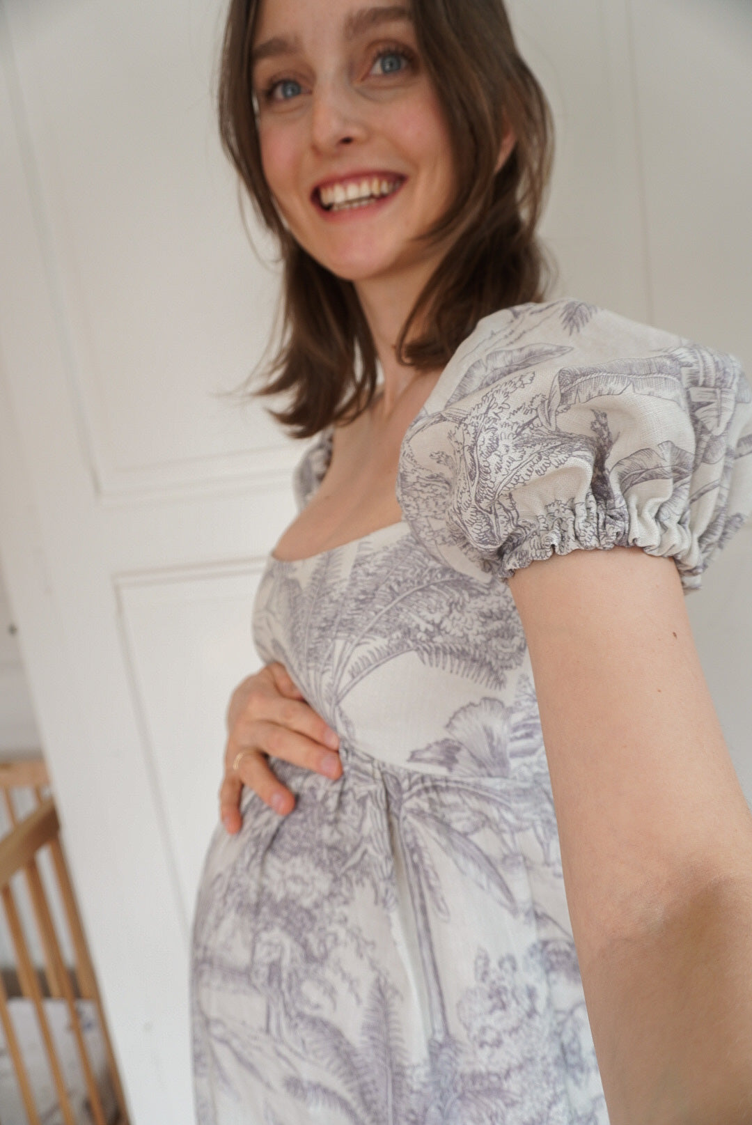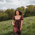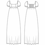 The Daphne Maxi Dress has a high empire waistline, is fitted over the bust, features short puff sleeves, and a long flowy skirt. This pattern is perfect for pattern hacking, as you can easily exchange the puff sleeves for straps or lengthen the puff sleeve to a ¾ sleeve. It is also very easy to shorten the skirt to a midi or mini length or even to a peplum top if desired. The bustier of the Daphne pattern with a simple gathered skirt would also look gorgeous. The options are endless.