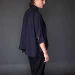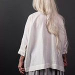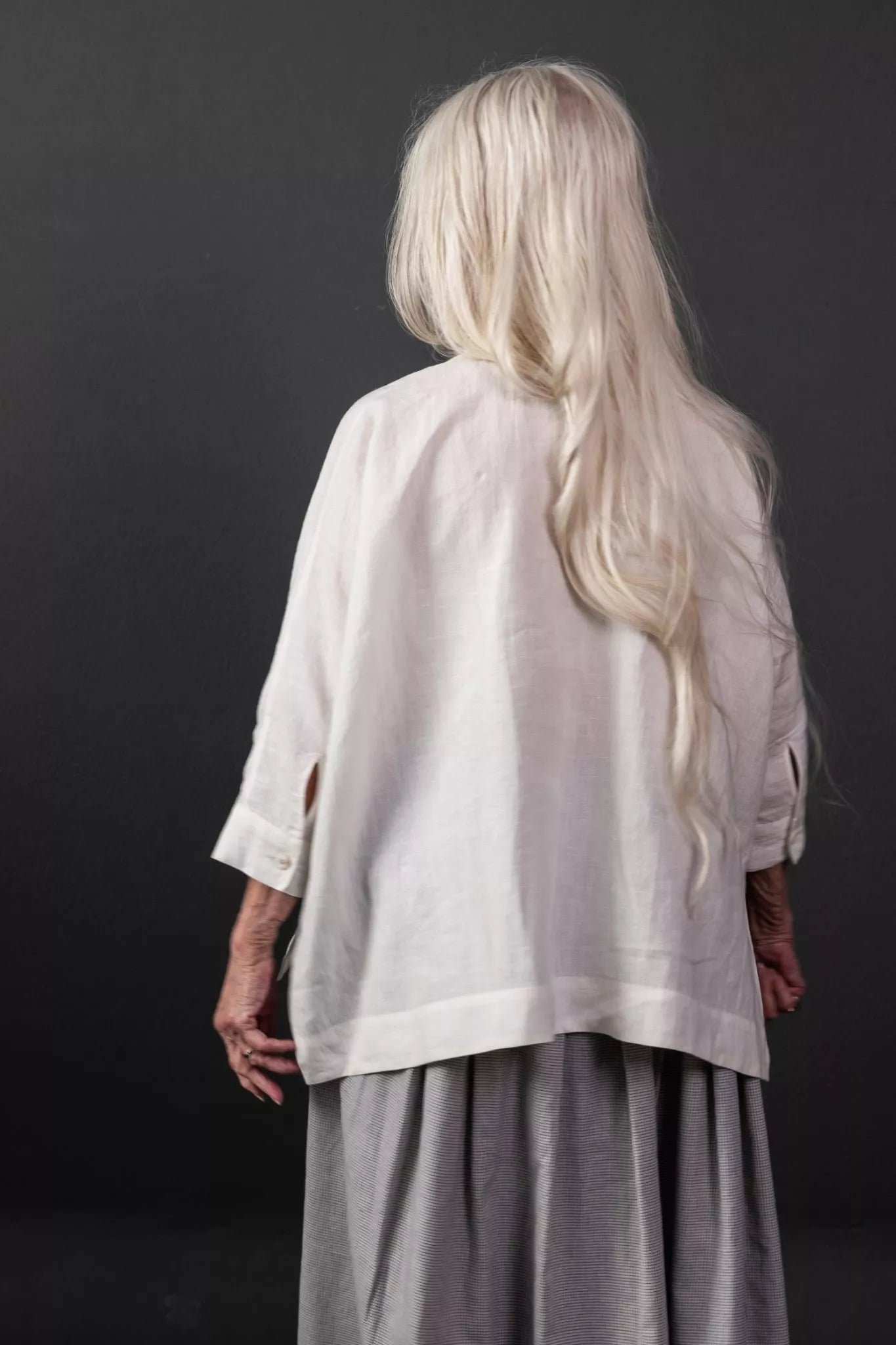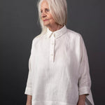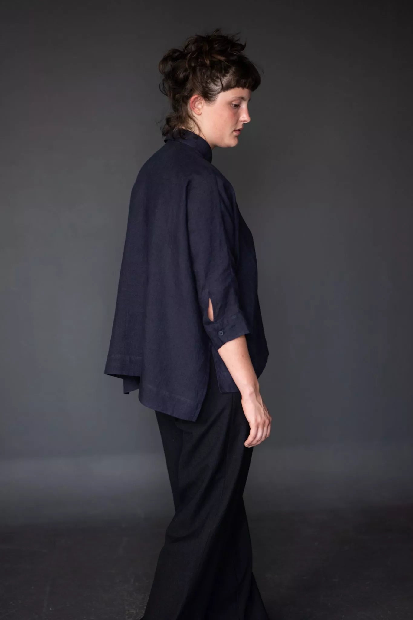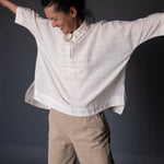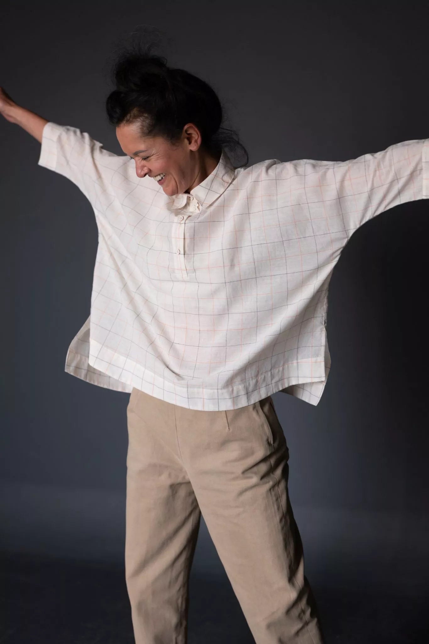 An oversized, boxy shirt with a dropped back hem and half placket. Swingy and absurdly comfortable.