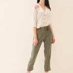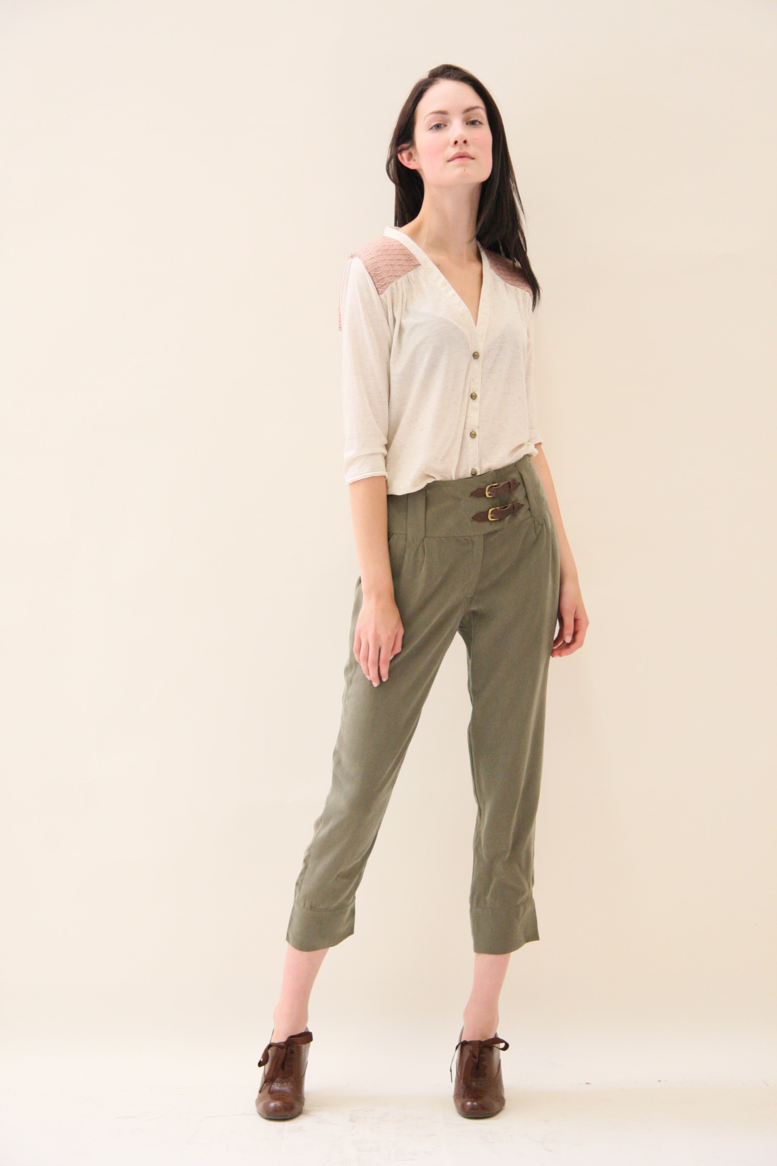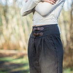 These elegant pants feature relaxed, tapered legs, useful pockets and roomy pleats.  The easy fitting legs are balanced with a closely fitted, wide waistband designed to highlight an hourglass figure by sitting high on the natural waist.  The jaunty, overlapped extension is a great place to display unusual buttons or buckles.