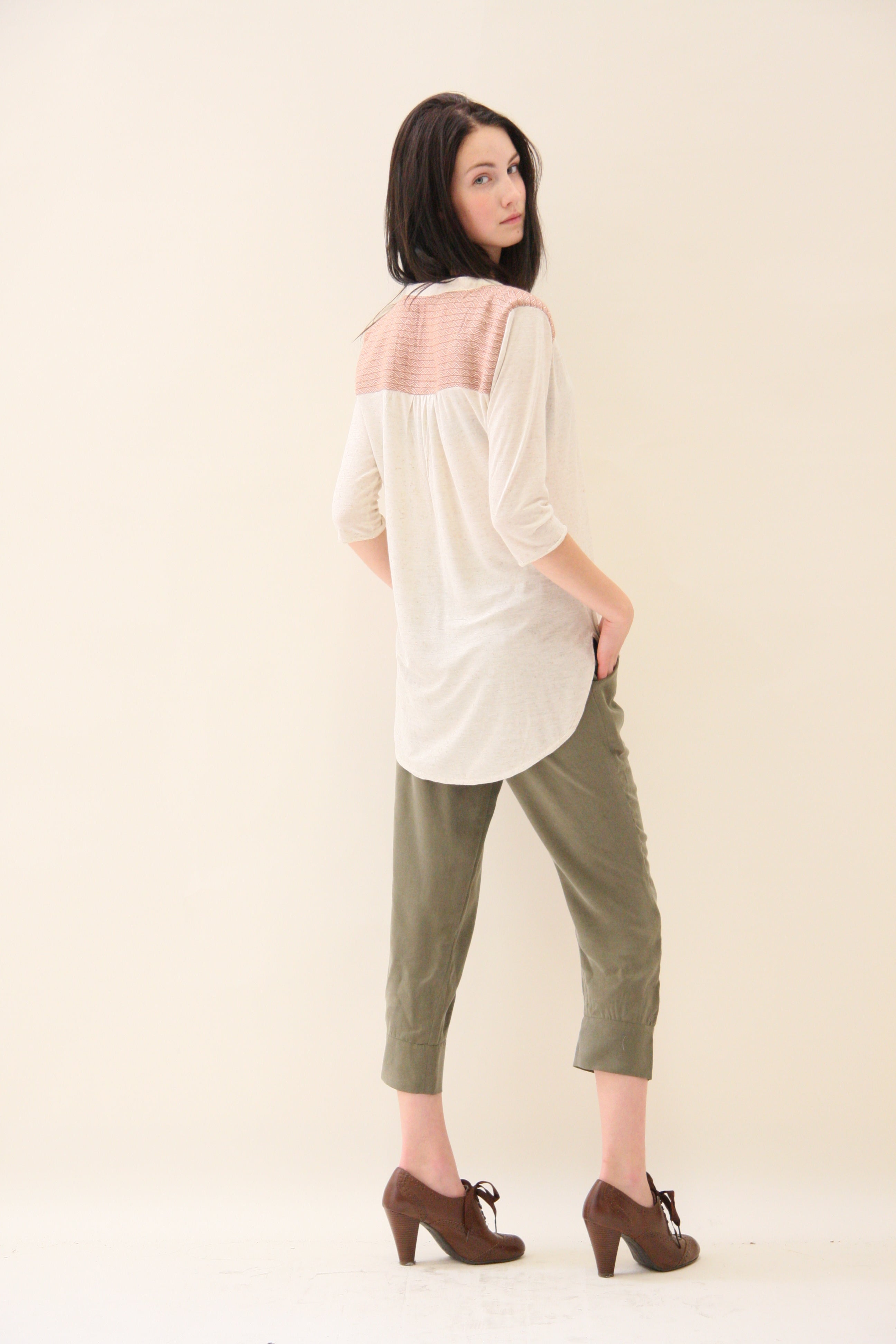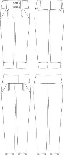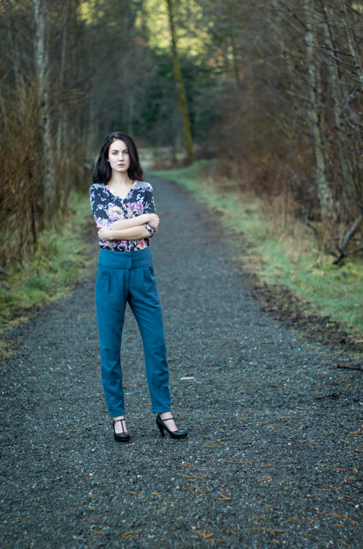 These trousers are most flattering and comfortable for women who like to bring attention to their waist.  They sew up nicely in floaty tencel or rayons or can be sewn in suiting fabrics (such as wool blends or raw silk).