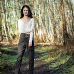 This sewing pattern includes two design variations: Sew full length trousers with a streamline waistband or create cuffed cropped trousers with large pointed belt loops.  The Lazos are an excellent introduction to all of the techniques involved in sewing trousers.  They are a relatively quick pant project (no yokes, no darts, no flat fell seams!) that will result in professional looking pants.