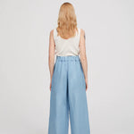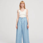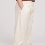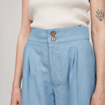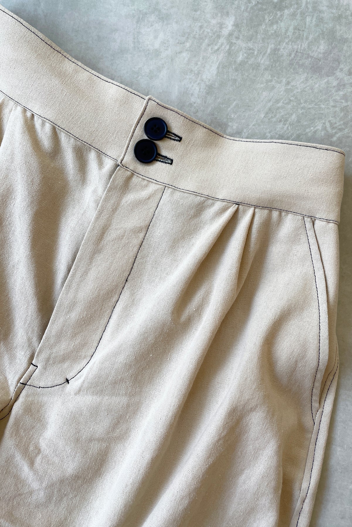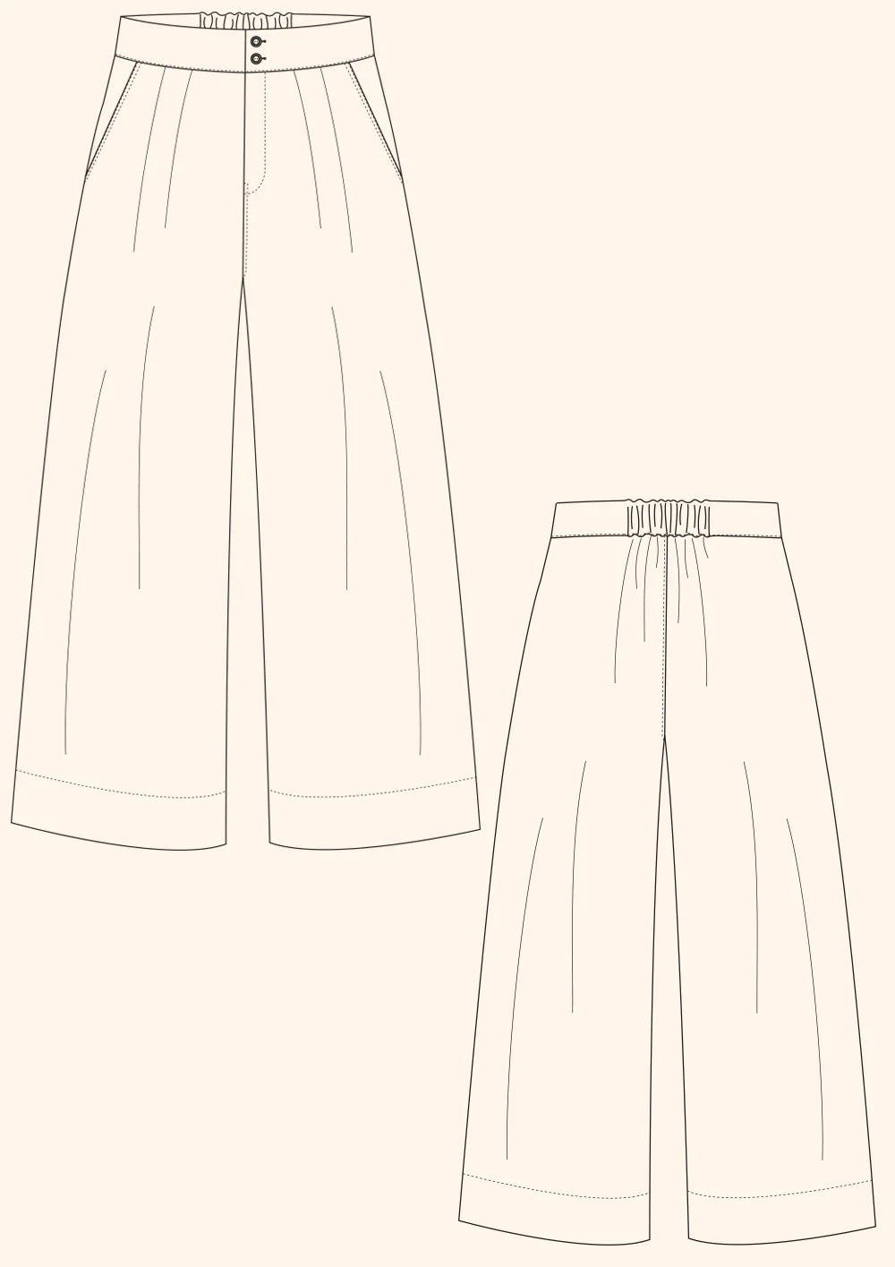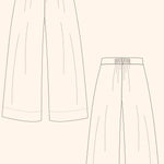 Suitable fabrics: This piece is predominantly designed to work with linens and light cottons, however there is also scope to play with heavier fabrics. Starting at the lighter end of the scale, linens and lightweight cottons are ideal for this piece. Silk and tencel are also great options for a more floaty and sophisticated look. If you want to make a wintery pair, this cut works well in a heavy brushed twill or a corduroy.
