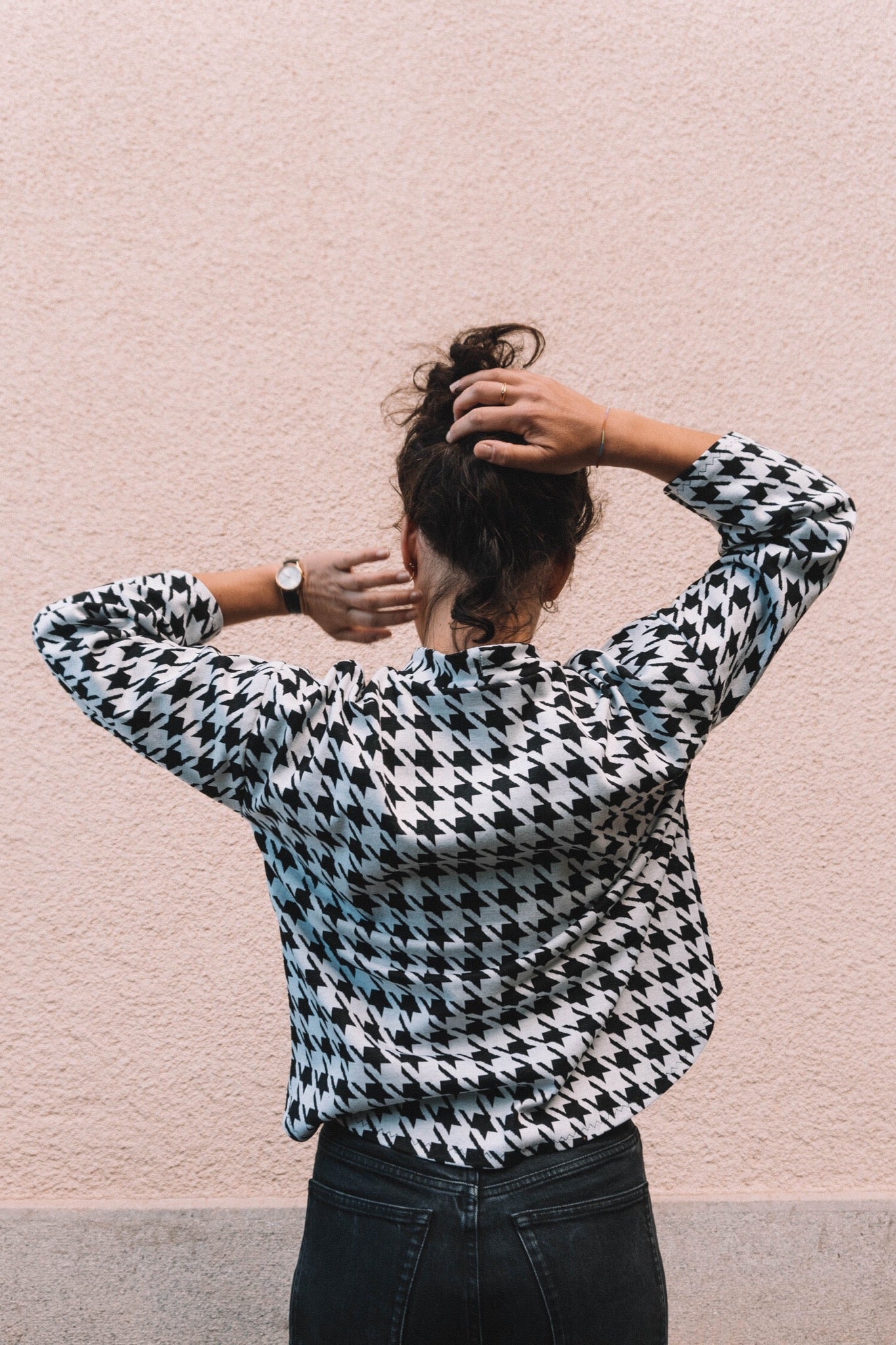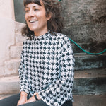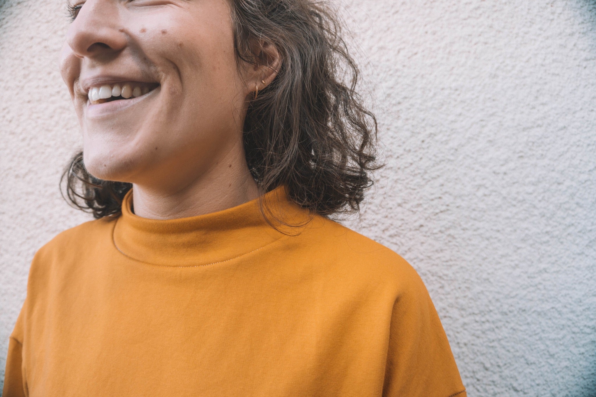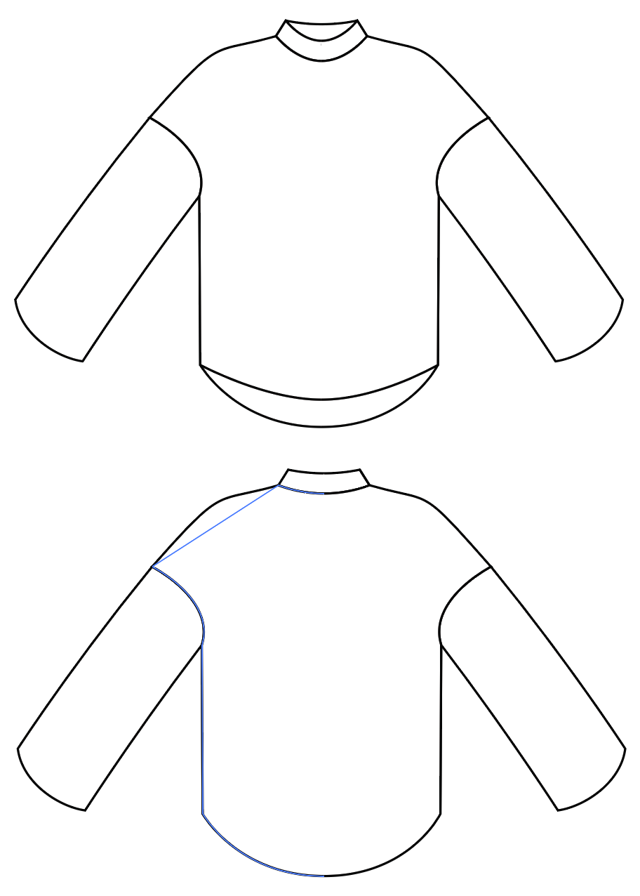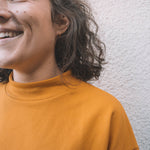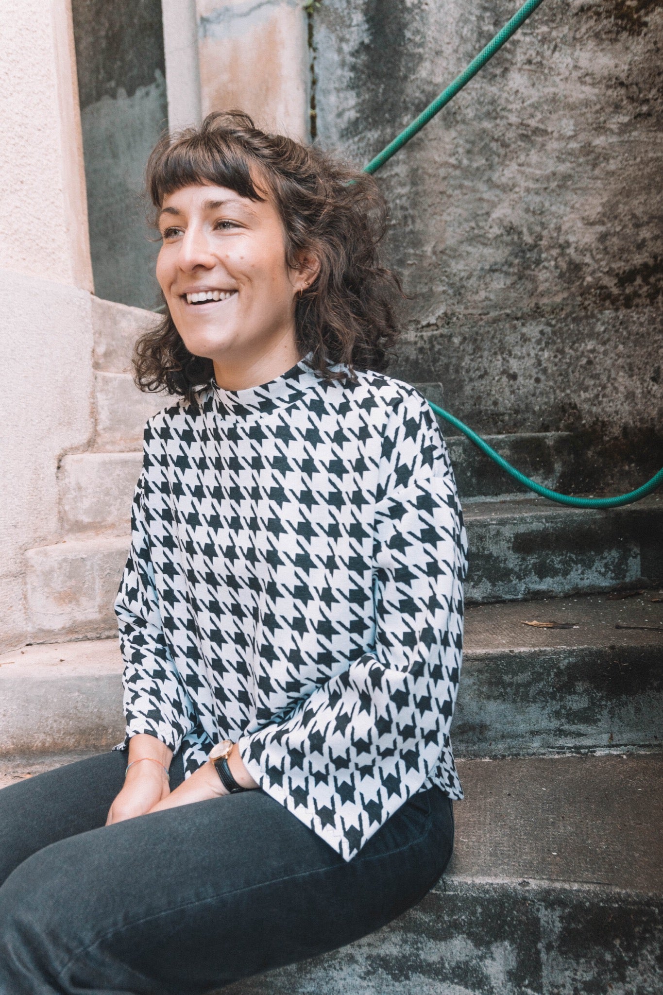 The Molly pattern comes with two views, one with long sleeves and one with short sleeves. The neckline features a beautiful mock neck and the front and back hem are curved, creating that gorgeous point at the bottom of the side seam. The dropped shoulder seam gives the top a relaxed look.