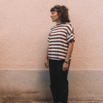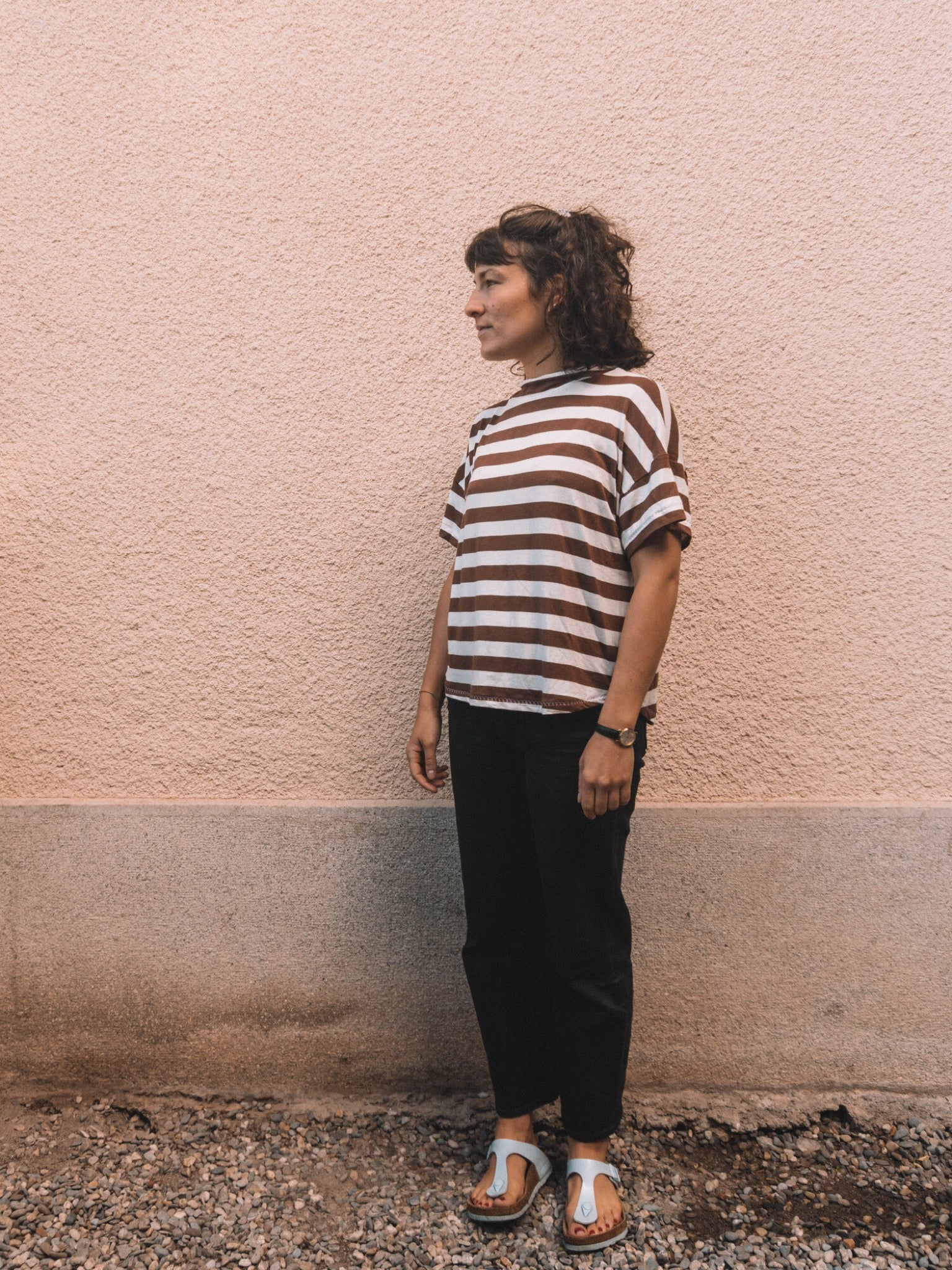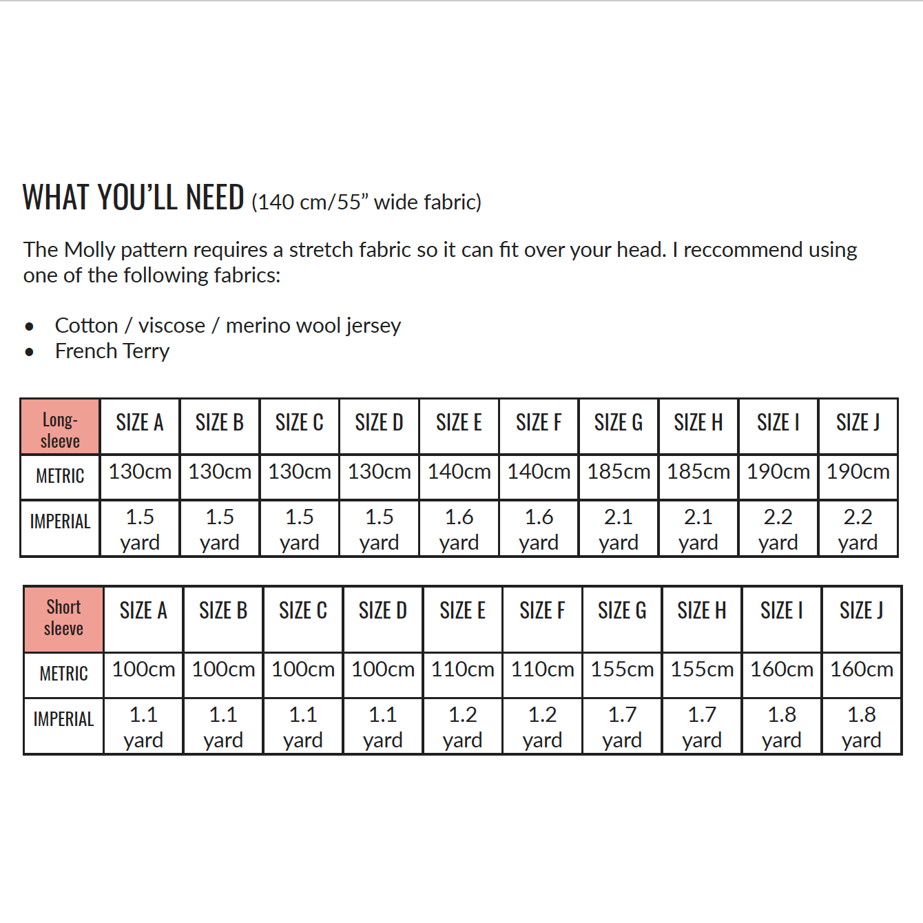 Medium to heavyweight knit fabrics with elastane, lycra, or spandex content are best suited for this pattern. I like the look of the top with stiffer knit fabrics, as it holds its shape much better.
