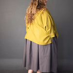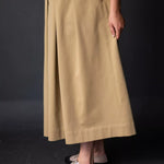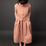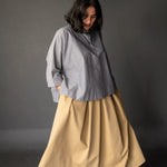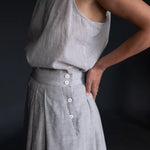 A pleated A-line skirt with slanted pockets, side button fastenings and pleats for fullness. Soft and floaty in linen, or smart and hardy in cotton twill. Can be made lined or unlined.