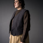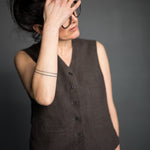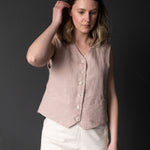 A softly structured waistcoat with a boxy fit, two welt pockets and a simple stitched belt at the back. Layer up in the winter or wear on its own in the summer in a tumbled linen.