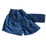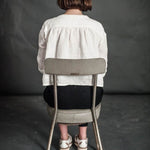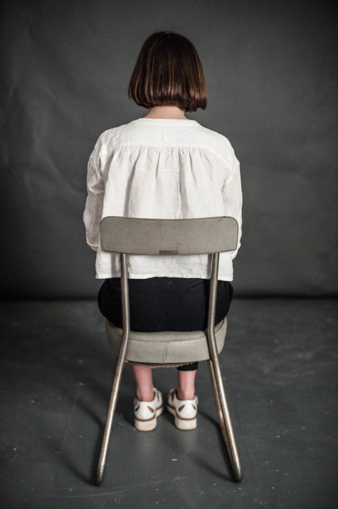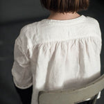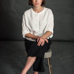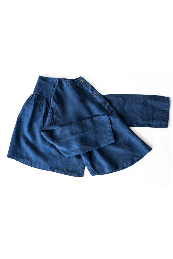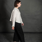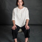The Swing Top is a loose fitting top with dropped shoulders, a Henley neck and button placket. It also features a shirt tail front and cropped back, gathered into the back yoke. We have paired it with 101 trousers in the picture, but it also pairs beautifully with our Eve trousers or Heroine jeans because of the high waist.
