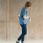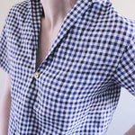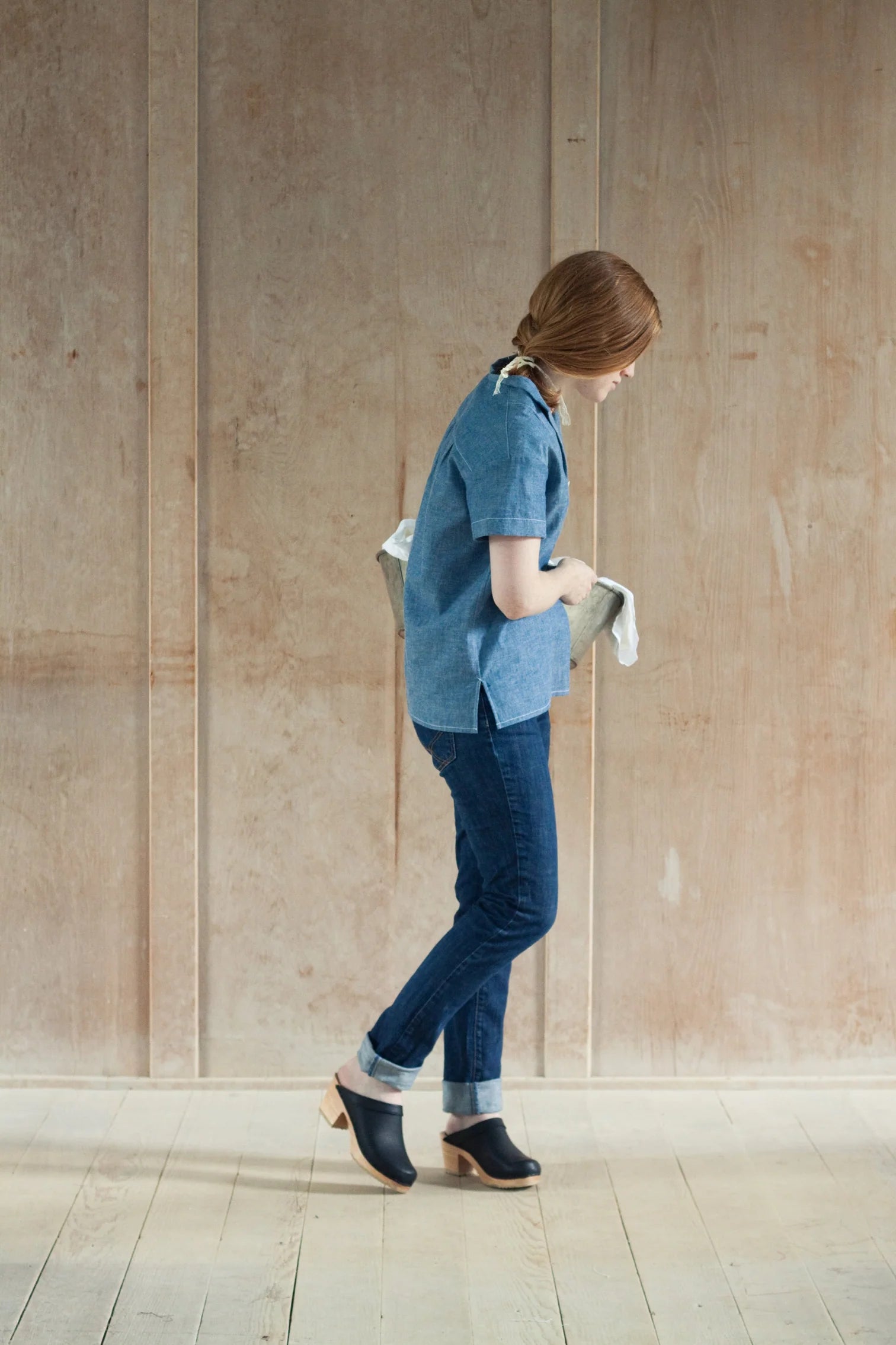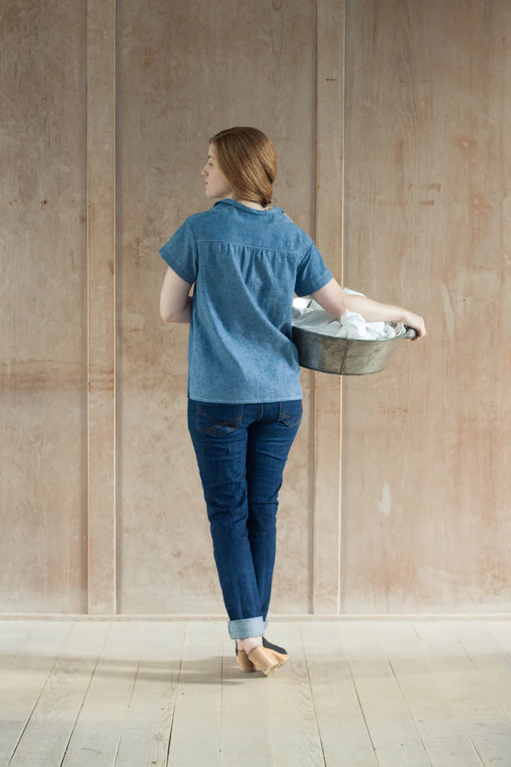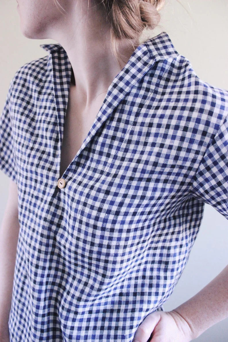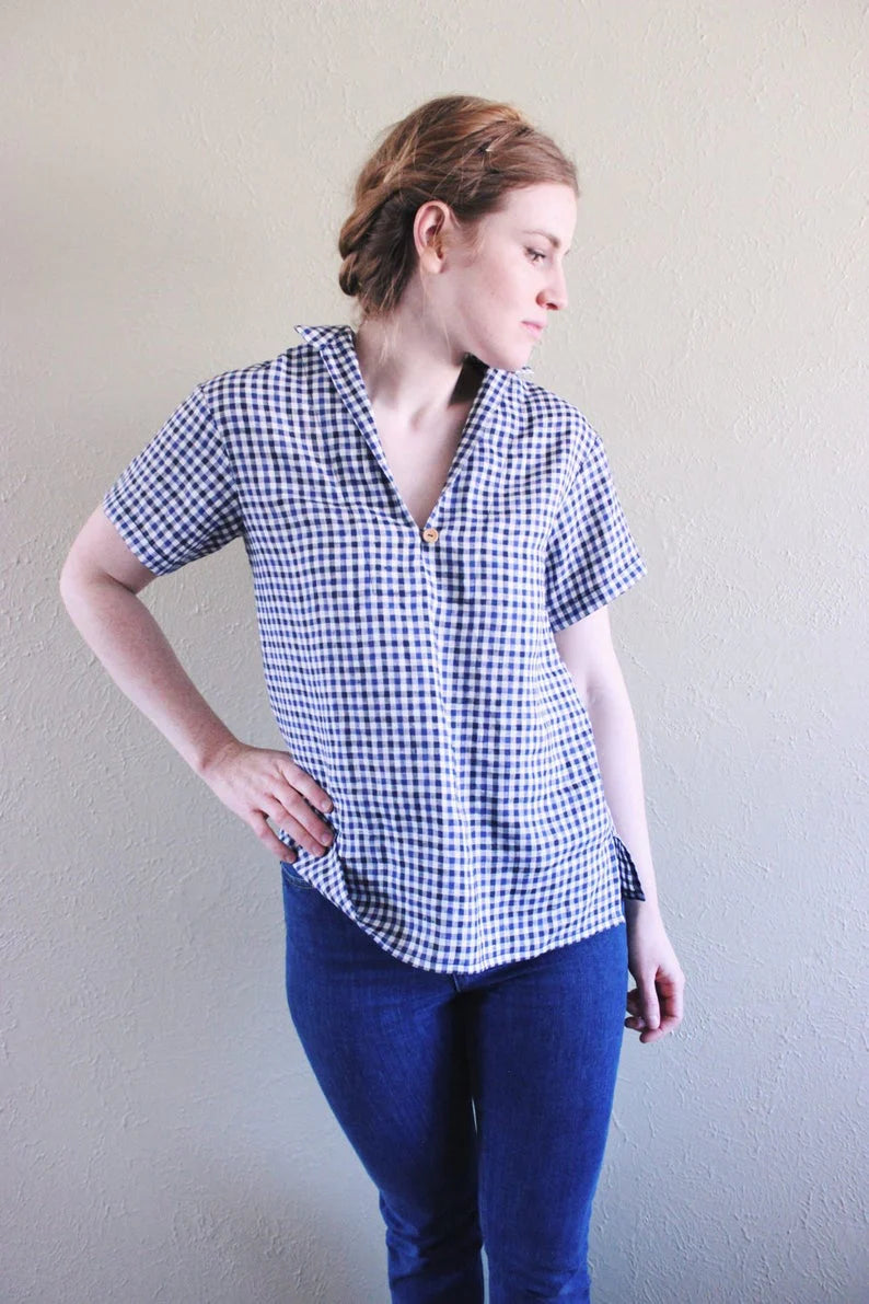 The Heidi Pullover top has straight lines with side slits, no bust darts, short sleeves and the back is gathered into a yoke. It has a straight collar, front slit that opens into a v-neckline with a button and thread loop closure.