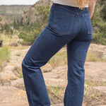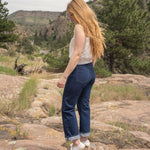 his pattern is based on heritage denim jeans from the 1930’s-1960’s. It has traditional 5 pocket styling including two front scoop pockets, a coin pocket inside the right front pocket, and two pointed patch pockets on the back. It also features slight hip shaping while keeping the side selvedge seams unaltered from hip to hem. It has a V-shaped back yoke and a traditional straight waistband with belt loops.