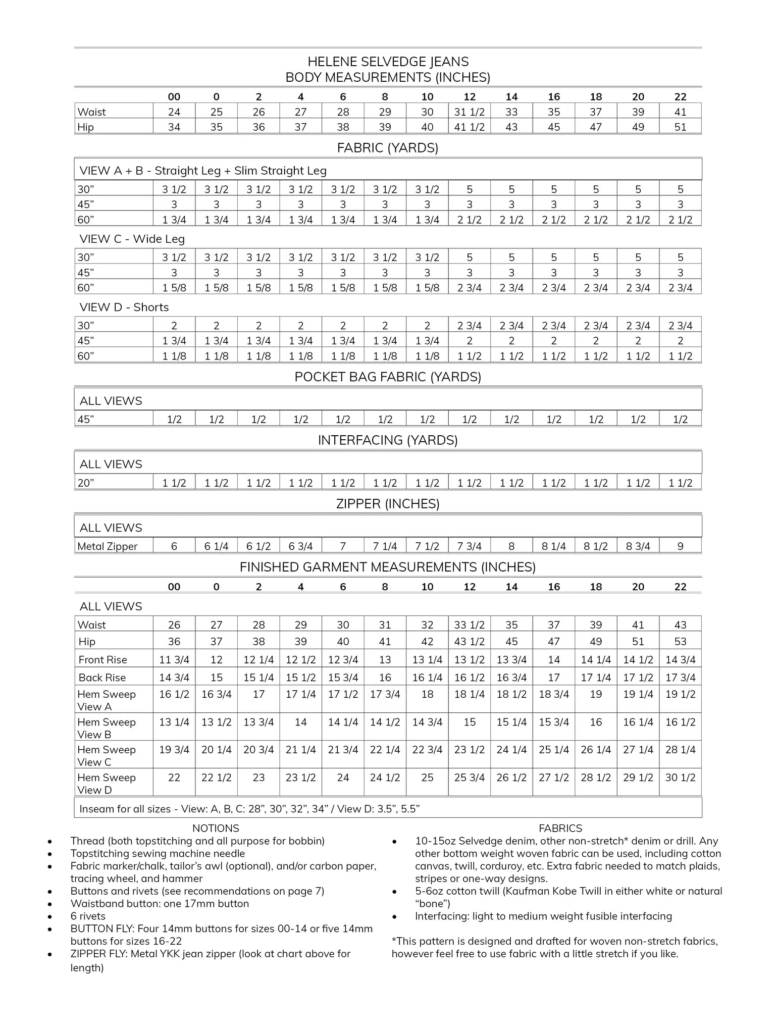The Helene selvedge jeans are a traditional high waist non-stretch jeans pattern and is available in two separate size ranges: 00-22 (hip 34”-51”) and 14-32 (hip 43”-61”).