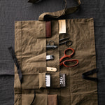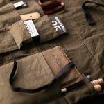 A versatile tool roll holder with 15 assorted pockets. It can be adapted to be worn around the waist (view 1). You can use either leather or webbing on the inside of the roll, if you are using leather we'd recommend something fairly lightweight like a goat's leather.