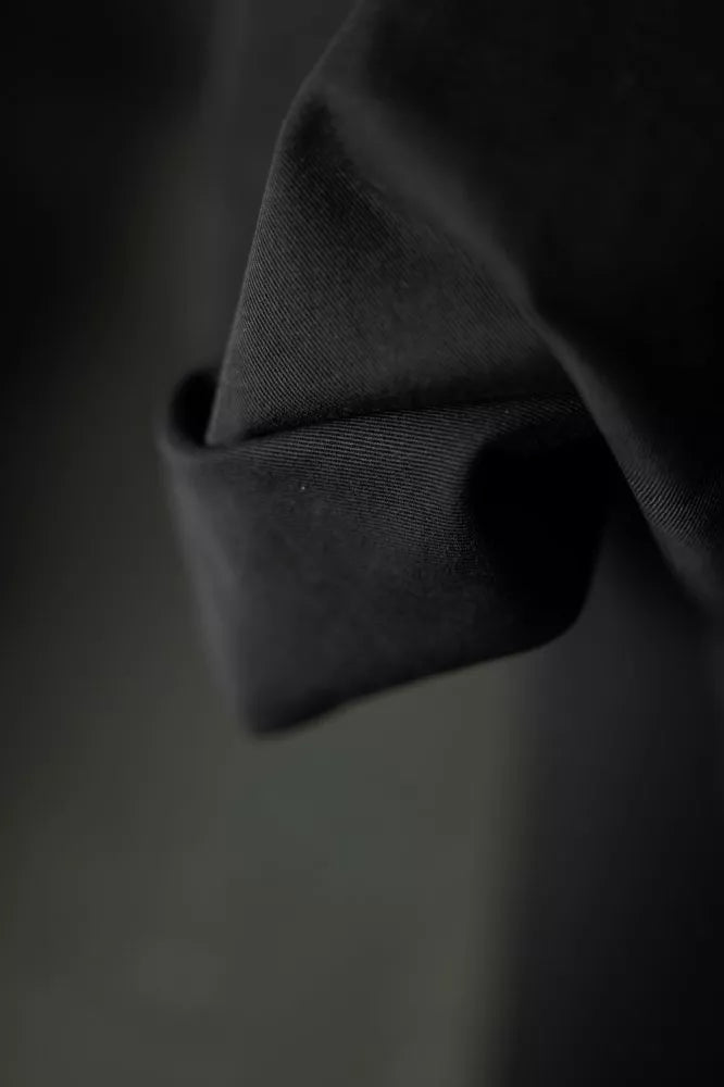 Black.This organic cotton has a fine twill with a soft sanded finish on one side. It would be ideal for trousers, dungarees and dresses that require some structure ie not a gathered waist, as well as lighter weight jackets and bag linings. It has a utility look and feel to it.