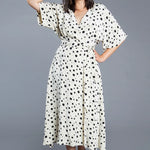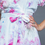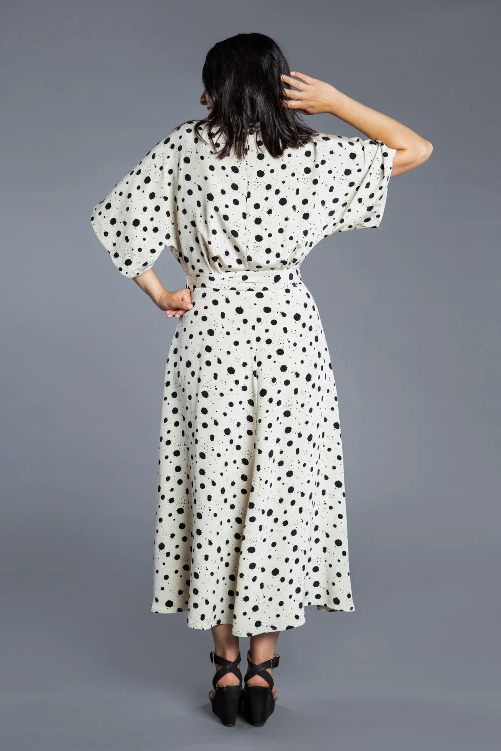 Elodie features a softly flowing bodice, with release pleats under the bust and a dolman style sleeve. Choose between a short sleeve or a longer, more formal option that ends at the elbow. The skirt is swishy and voluminous and comes in three lengths, above the knee, midi or maxi, with optional patch pockets.