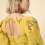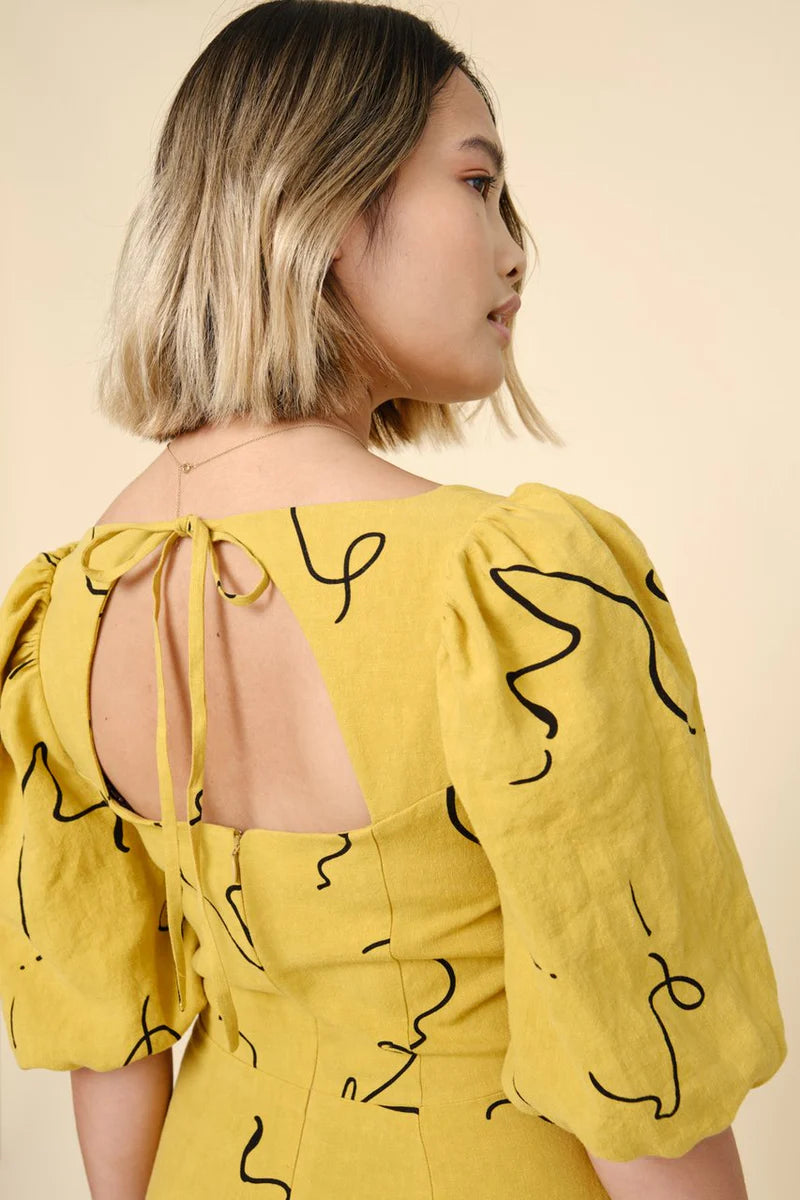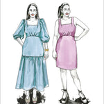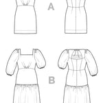 View A is a chic, sleeveless sheath with a straight skirt that hits just above the knee. View B features a striking puff sleeve in two lengths and a midi-length tiered skirt. All views feature a unique bodice design that incorporates knife pleats at the waist, a face-framing square neckline and a keyhole opening in the back bodice tied at the nape of the neck. Pauline can be made unlined or fully lined and is closed with an invisible zipper at center back.