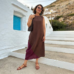 Aida Dress is a midi-length dress with colour-blocked panels forming a sculptural silhouette. Slightly flared and semi-fitted with bust darts, this sleeveless dress features a wide neckline allowing it to easily slip over your head. The neckline and armholes have contrasting binding and a narrow hem finishes the asymmetrical hemline of this striking design