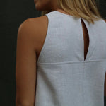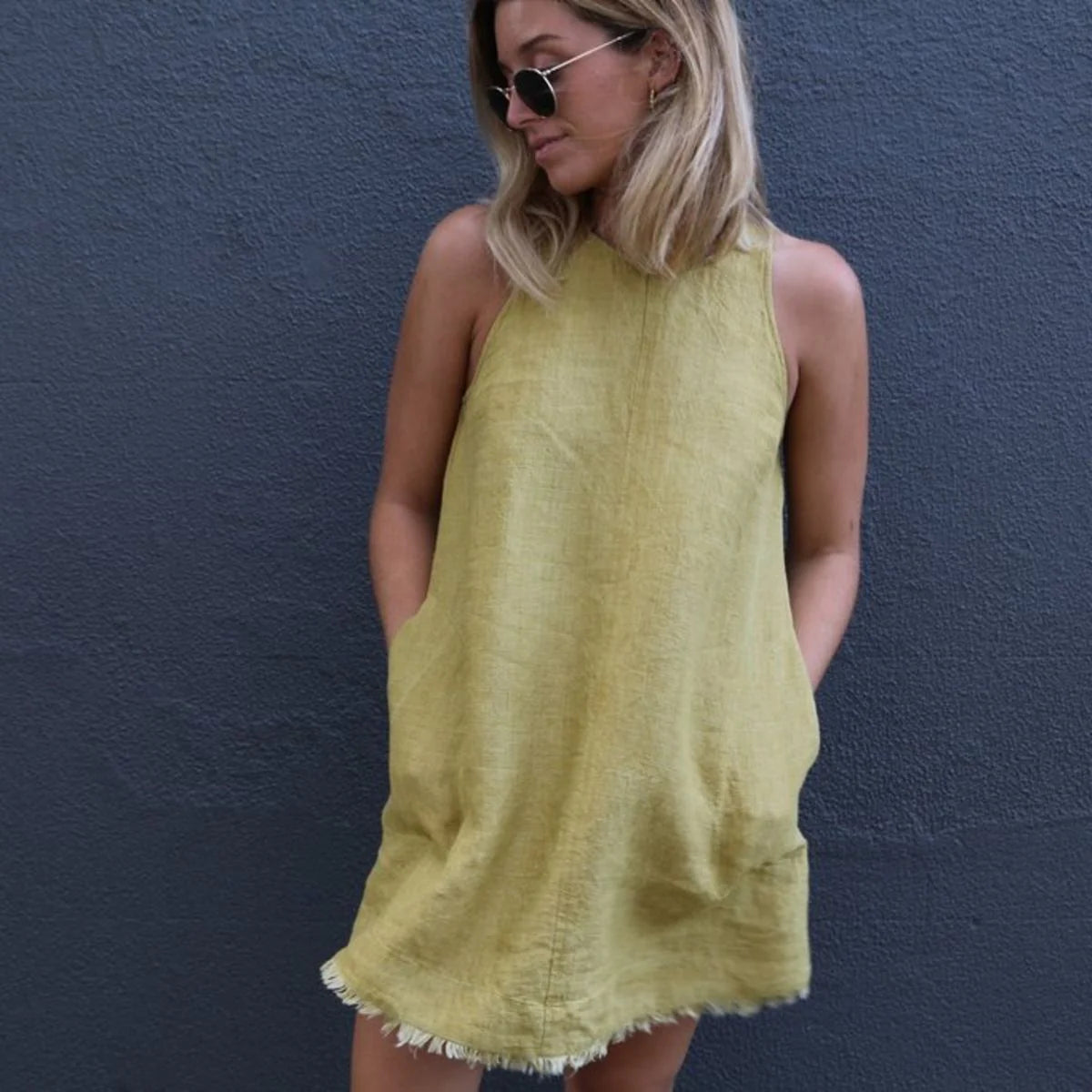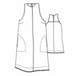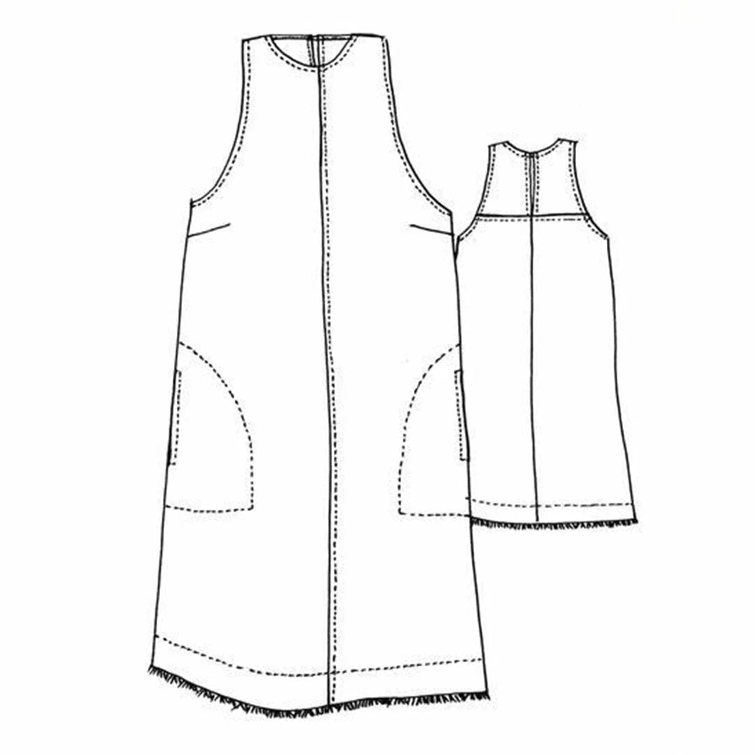 The Bondi Dress pattern is a sleeveless style featuring a high neckline, cut away armholes, bust darts, side pockets, centre front/back seam and back yoke with neck opening. The gently flared hem is finished with a facing and an optional fringe edging.