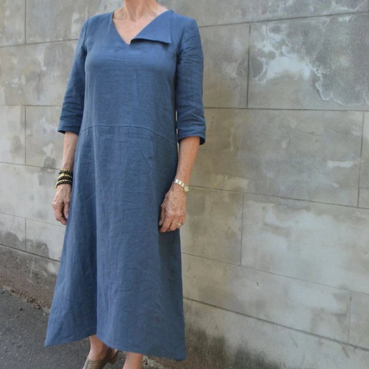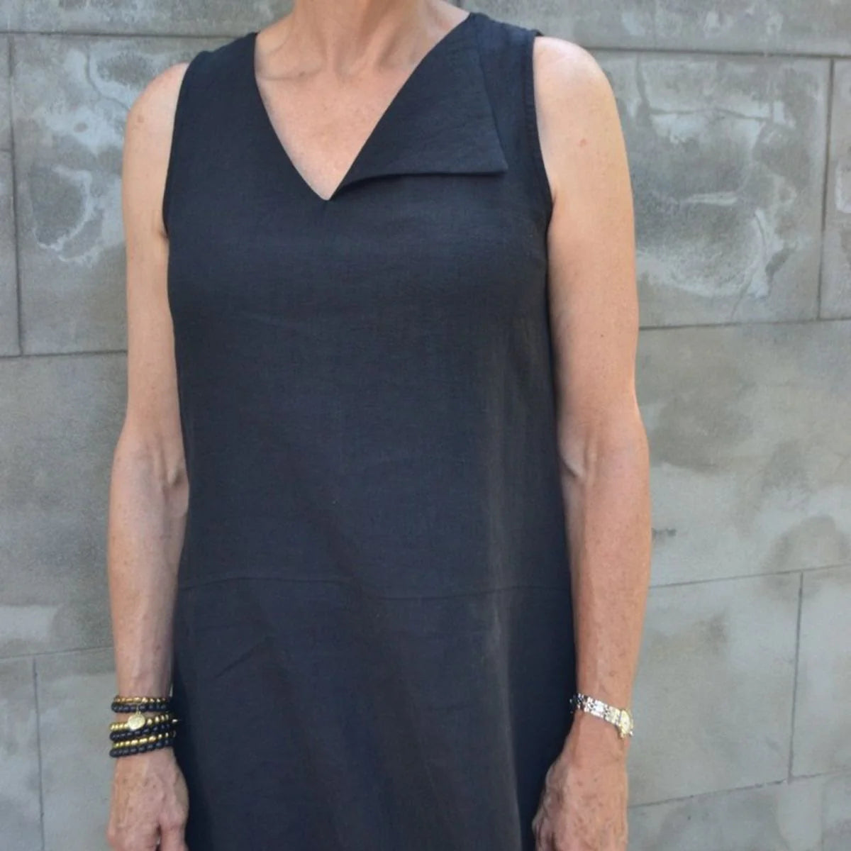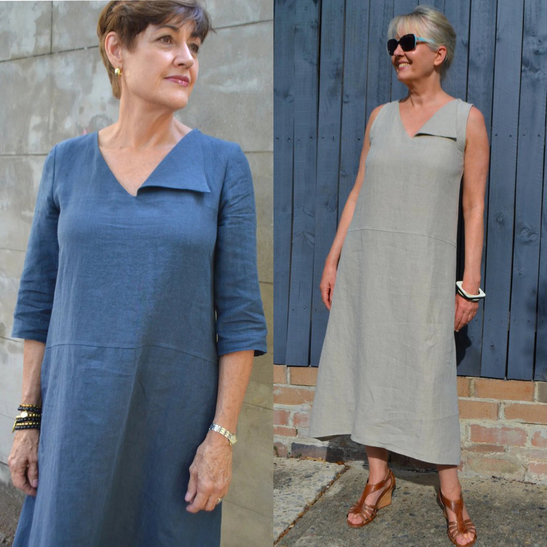The flared Sophie Dress features a single lapel V-neckline, drop waistline and centre back seam with dipped hemline at the side seams. The pattern includes options for sleeveless or elbow-length sleeves.