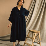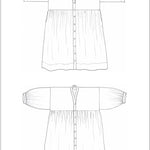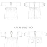 This is an oversized dress with a dropped shoulder, gathered skirt, side pockets and full length button placket with buttons and button holes. Can be worn as a dress or an open jacket. The skirt seam is designed to sit over the bust. Lengths of bodice and skirt are easily adjustable to your preference. The width of the garment is variable depending on the fabric width you use. Comes with 2 simple hack options, one of which does not require buttons or button holes.