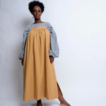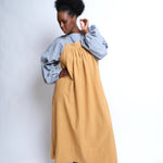 The ZW TIER DRESS is made up of 3 separate cutting plans which can be mixed and matched to make 4 different dresses. A short dress with thin straps, long dress with thin straps, short dress with sleeves and long dress with sleeves. If you are not using the sleeve then the strap for the dress will need to be cut from a contrast or remnant fabric. This dress has an above the bust self lined panel, the A-line dress below this is gathered on. There is also a bottom gathered tier that can be added to the dress and a gathered sleeve with an elasticated hem. The sleeve is hand sewn to the strap and underarm after the dress has been fully made. There are 2 different pattern layout options for this dress, which vary slightly depending on what size you are using.