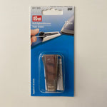 The practical Prym tape maker makes perfect forms of any length of bias binding possible, for binding fabric edges or patchwork quilts. By cutting the fabric strip at a 45 degree angle to the grain of the fabric, the bias binding has stretch and is easily attached, even on curves. After the fabric strips are cut and joined together, the material is introduced and pulled through the wide opening of the tape maker On the flat side of this useful aid the perfectly folded bias binding can be pulled out and can be smoothed out directly with the iron.