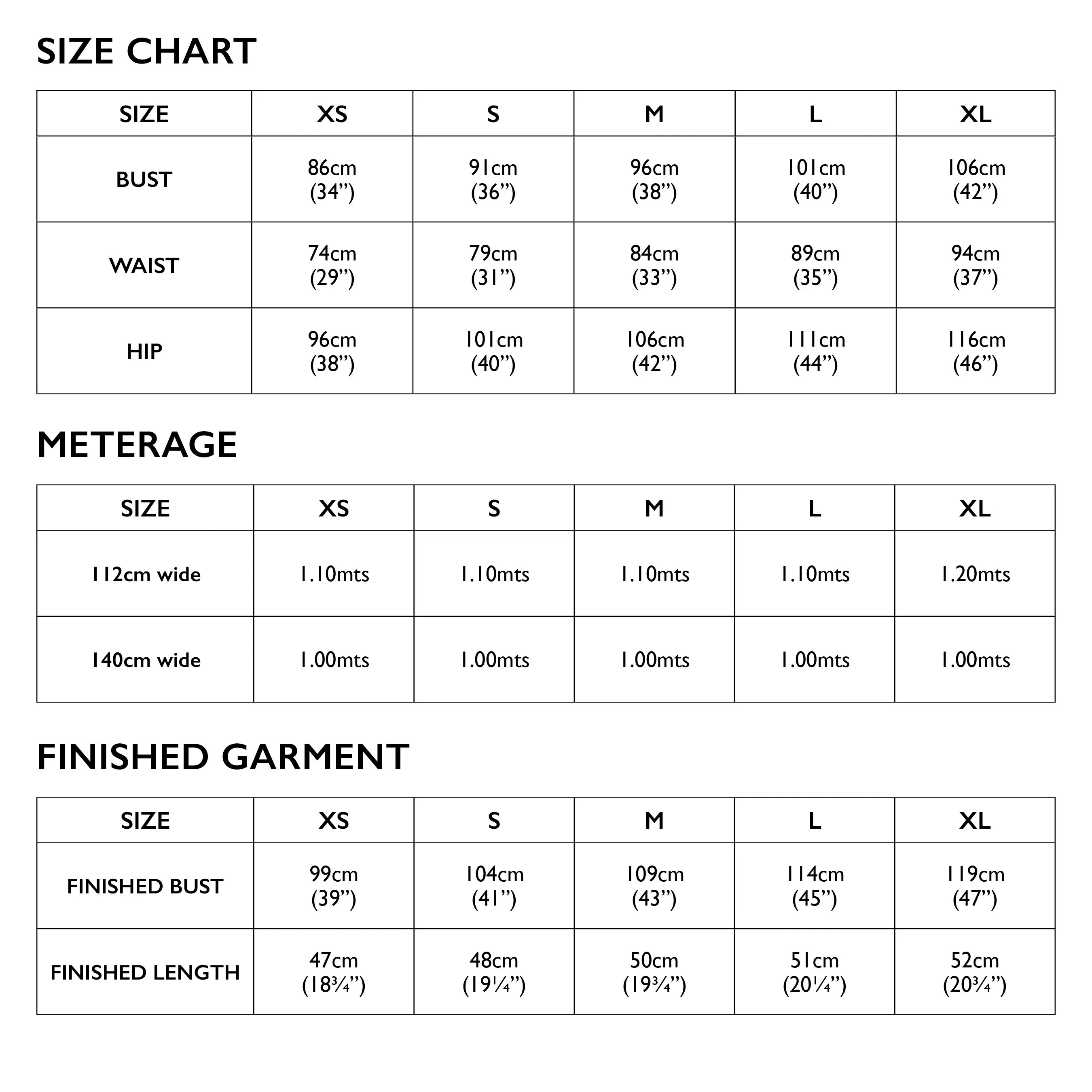 Recommended fabrics: light to medium weight linen and cotton, textured cotton and wool crepe.