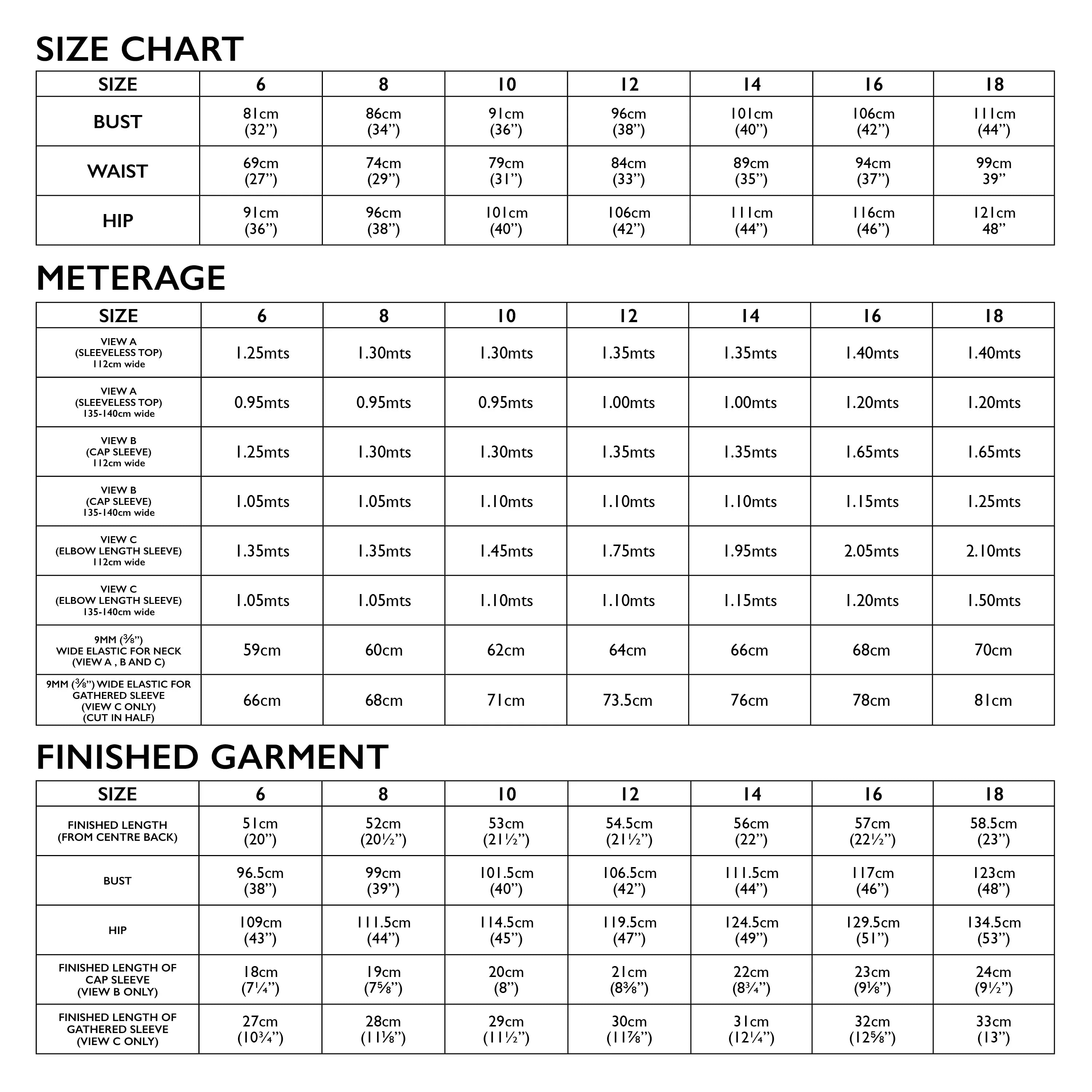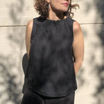 The Rae Top is a relaxed pull-on top with stylish design features including a wide, gathered neckline. The pattern includes options for a sleek sleeveless look with bound armholes (View A), cap sleeves (View B) or soft, elbow length sleeves with gathered hems (View C).