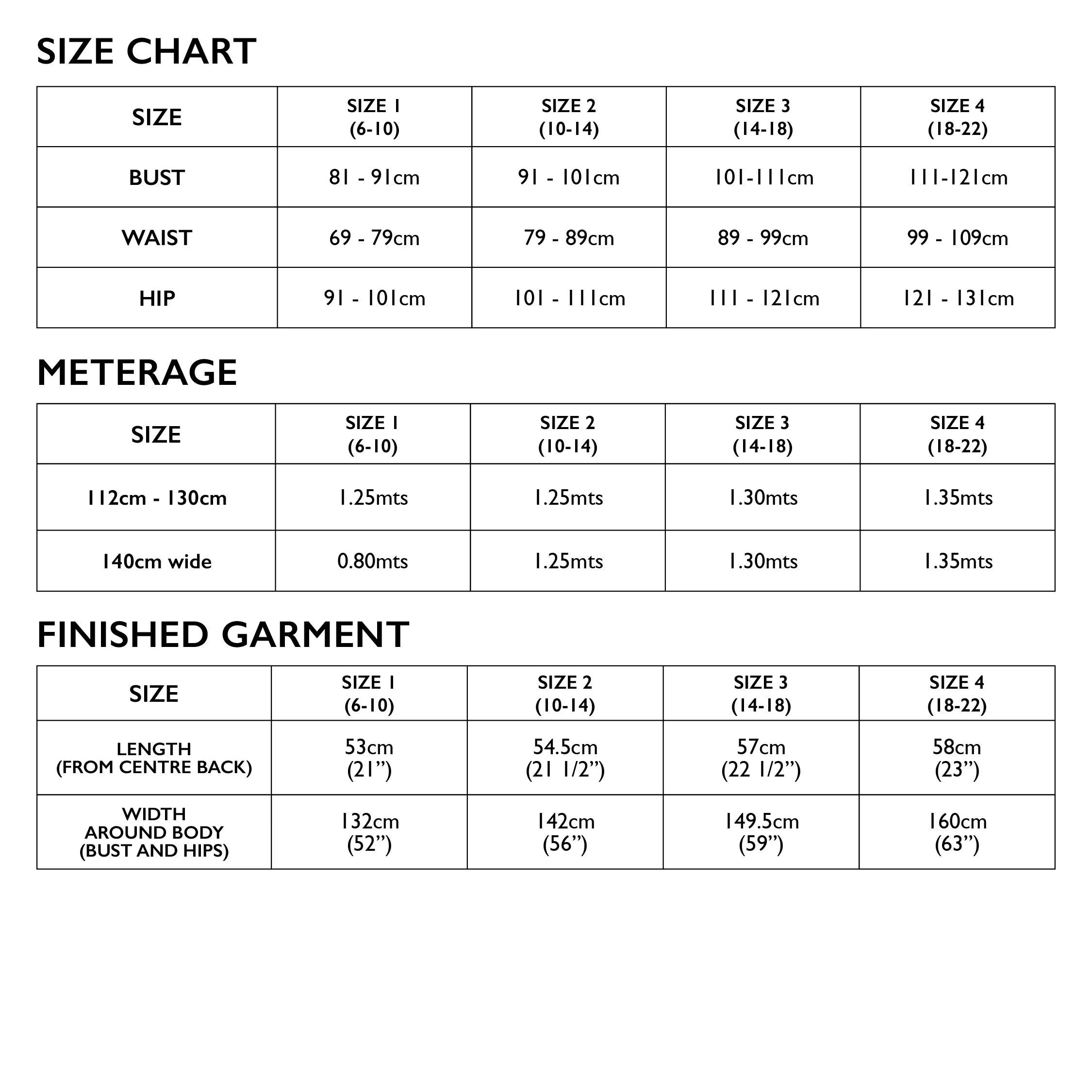 Meterage/Finished measurements: See table in images