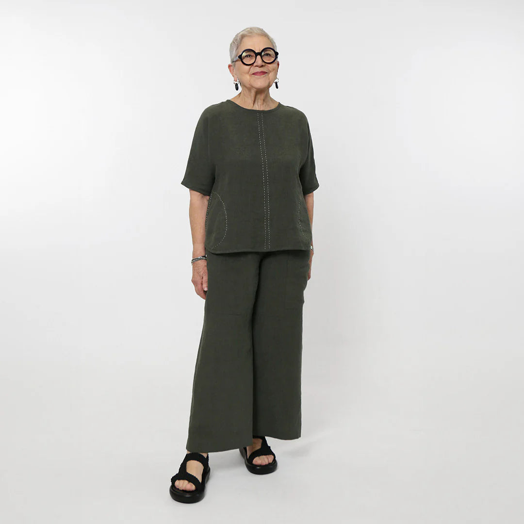 The Cora top pattern is a sweet and simple style featuring a topstitched centre front seam and stitched-down inseam pockets. An exposed binding finishes the round neckline, short grown on sleeves and curved hem. Pull-on and hip length - the back is slightly longer than the front - it’s easy to fit, sew and style, making it the perfect garment for pairing with skirts, pants, jeans and shorts.