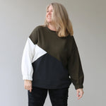 The Lennox Sweatshirt is a loose, boxy style feauring drop shoulders and self-fabric neck and hem bands with twin needle detail stitching. View A has a traditional V-detail at the neckline and View B has striking asymmetric colour-blocking. Sleeves can be either tapered with a sleeve band or straight and gathered into wide elasticized cuffs.