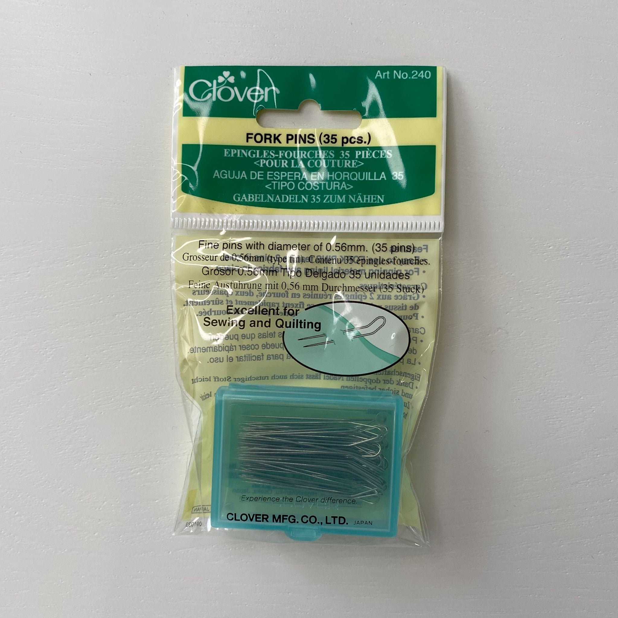 Clover fork pins feature two parallel pins joined by a curve in the end, these Fork Pins are good for firmly holding slippery fabrics in place and ideal for matching up plaid fabrics and quilting pieces for expertly lined-up seams. This pack contains 35 pins, size 0.56 x 40mm.