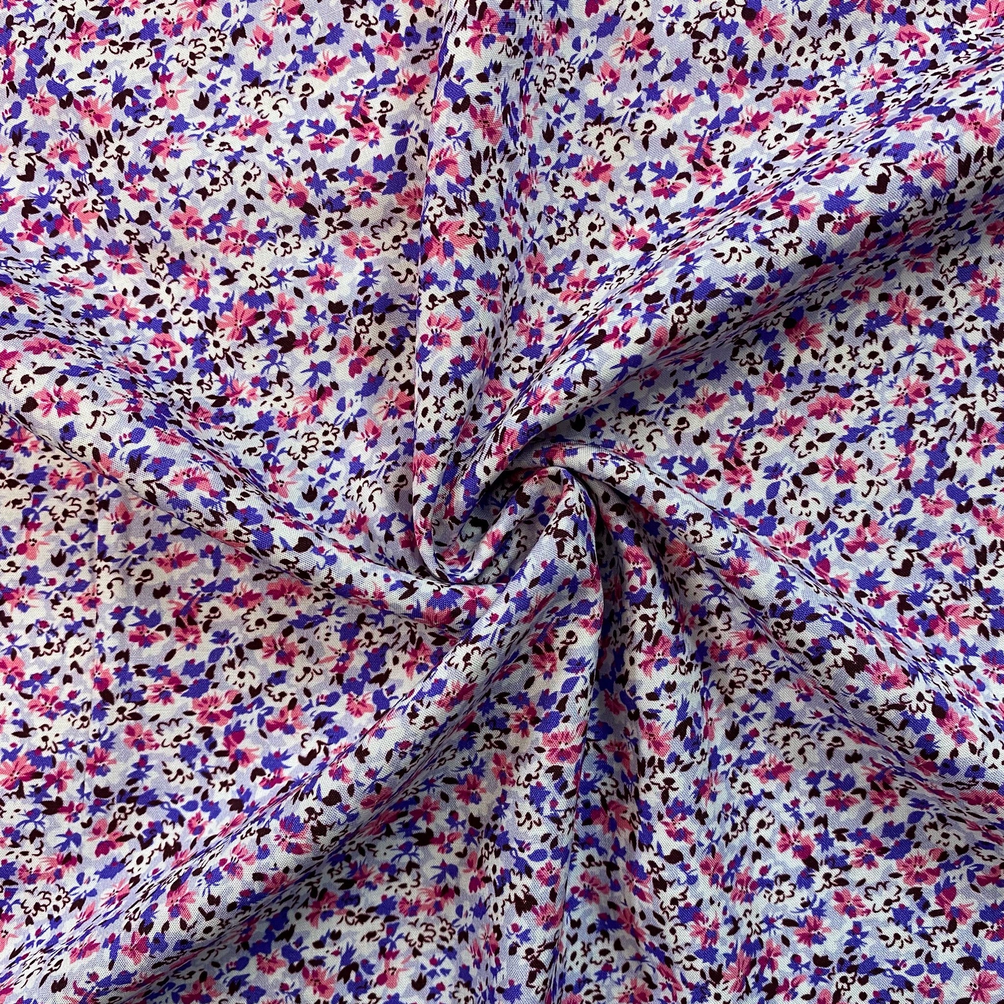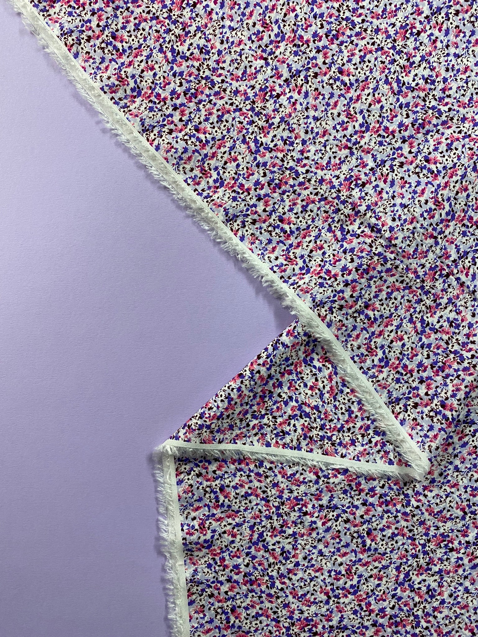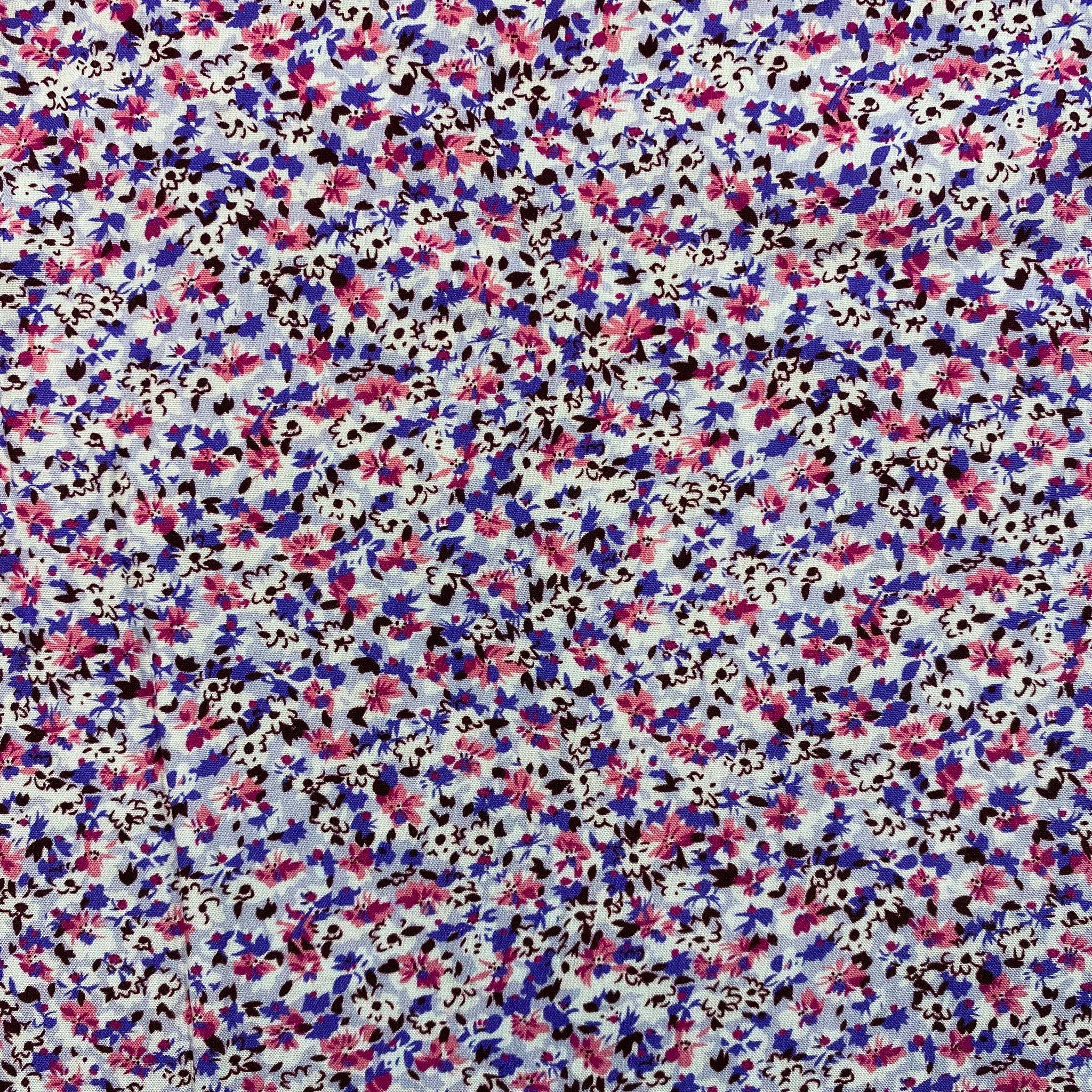 This viscose fabric features an intricate ditsy design of pink and lilac flowers, it offers delightful drape and is ideal for creating breezy summer blouses, shirts, dresses, skirts, or even cozy pajamas.