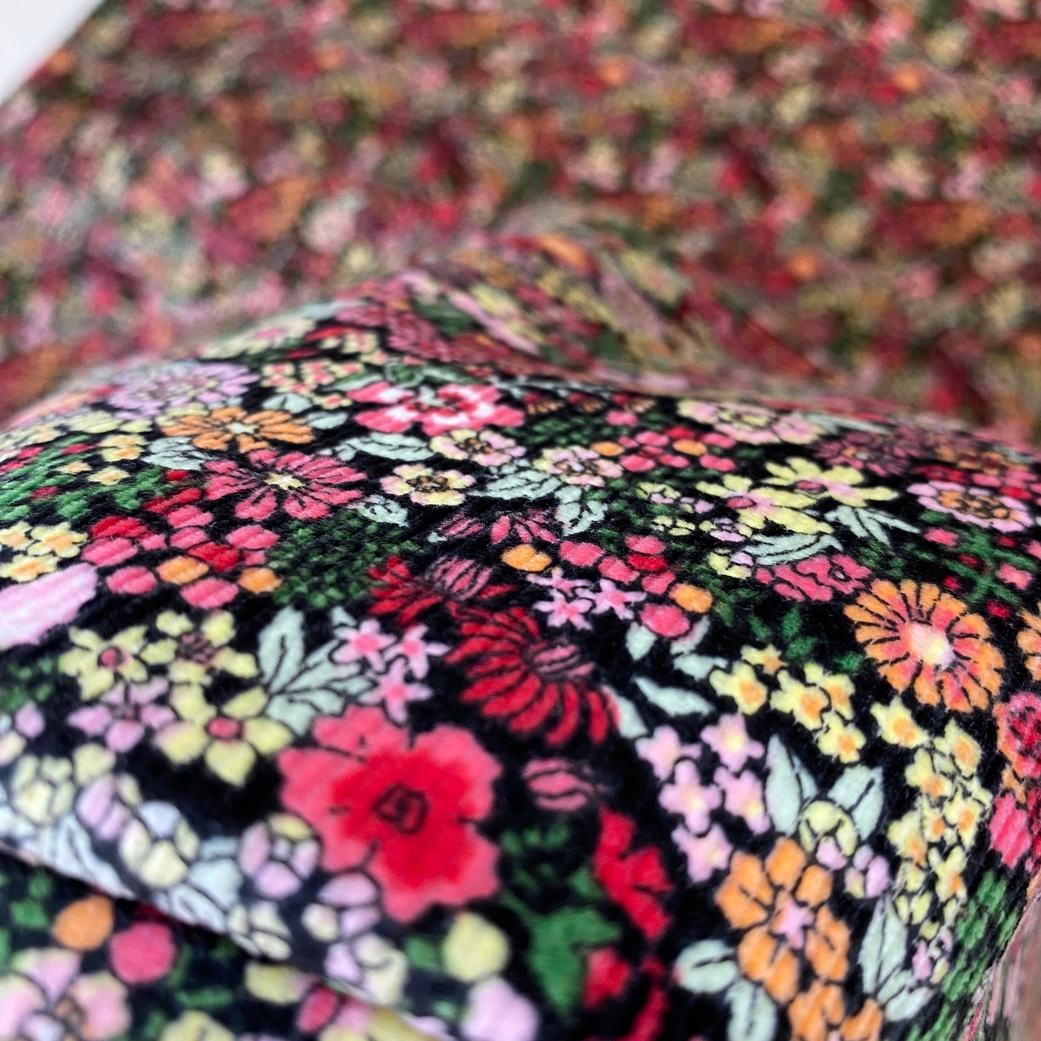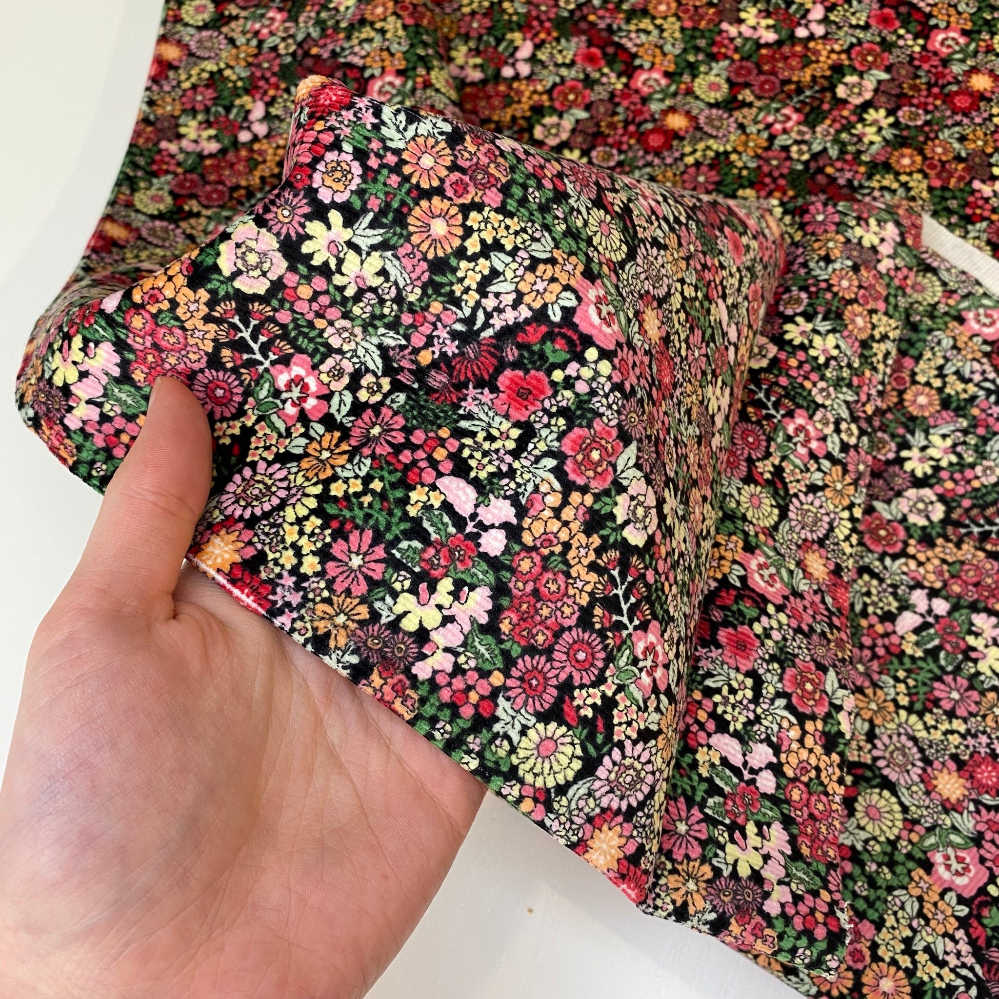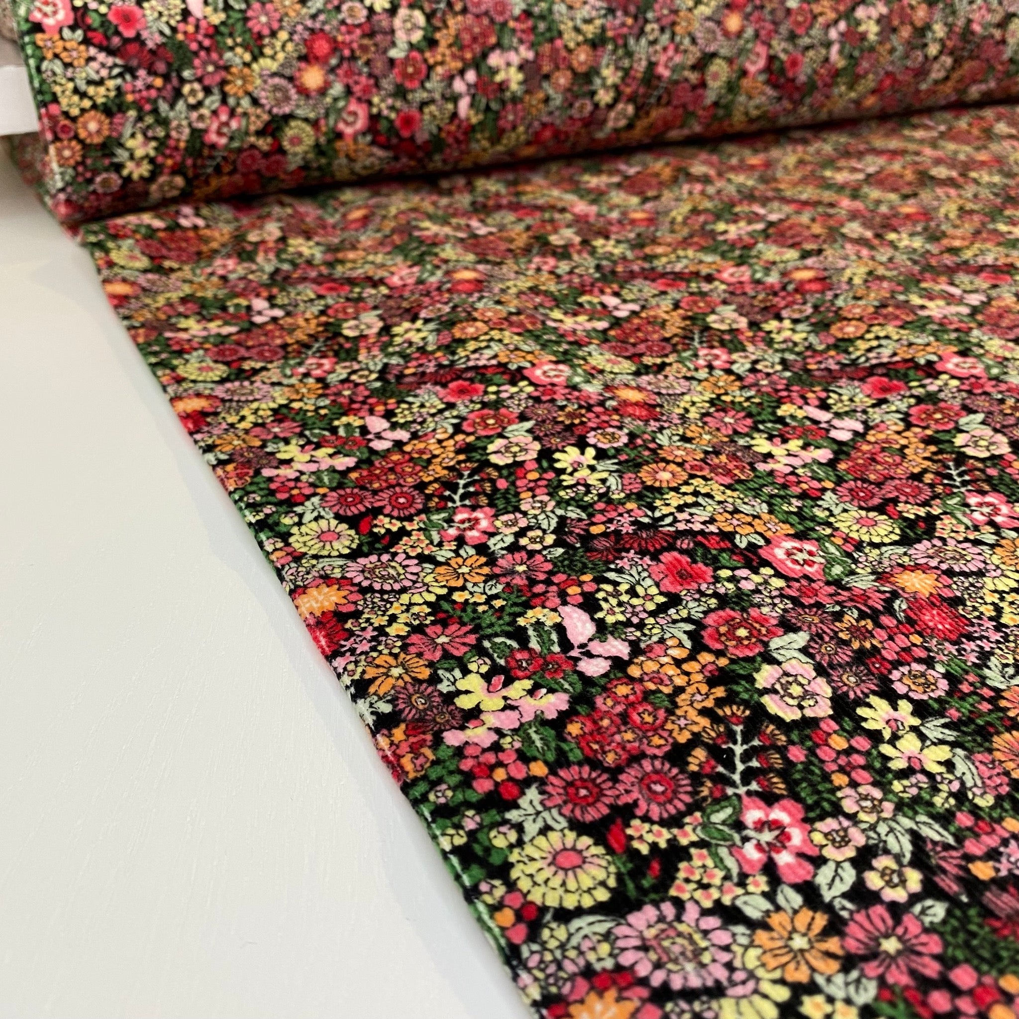 This soft touch corduroy pops a beautiful range of colours It's super warm floral design is perfect for those garments you want to stand out, pinafore, trousers, shirts, dresses.