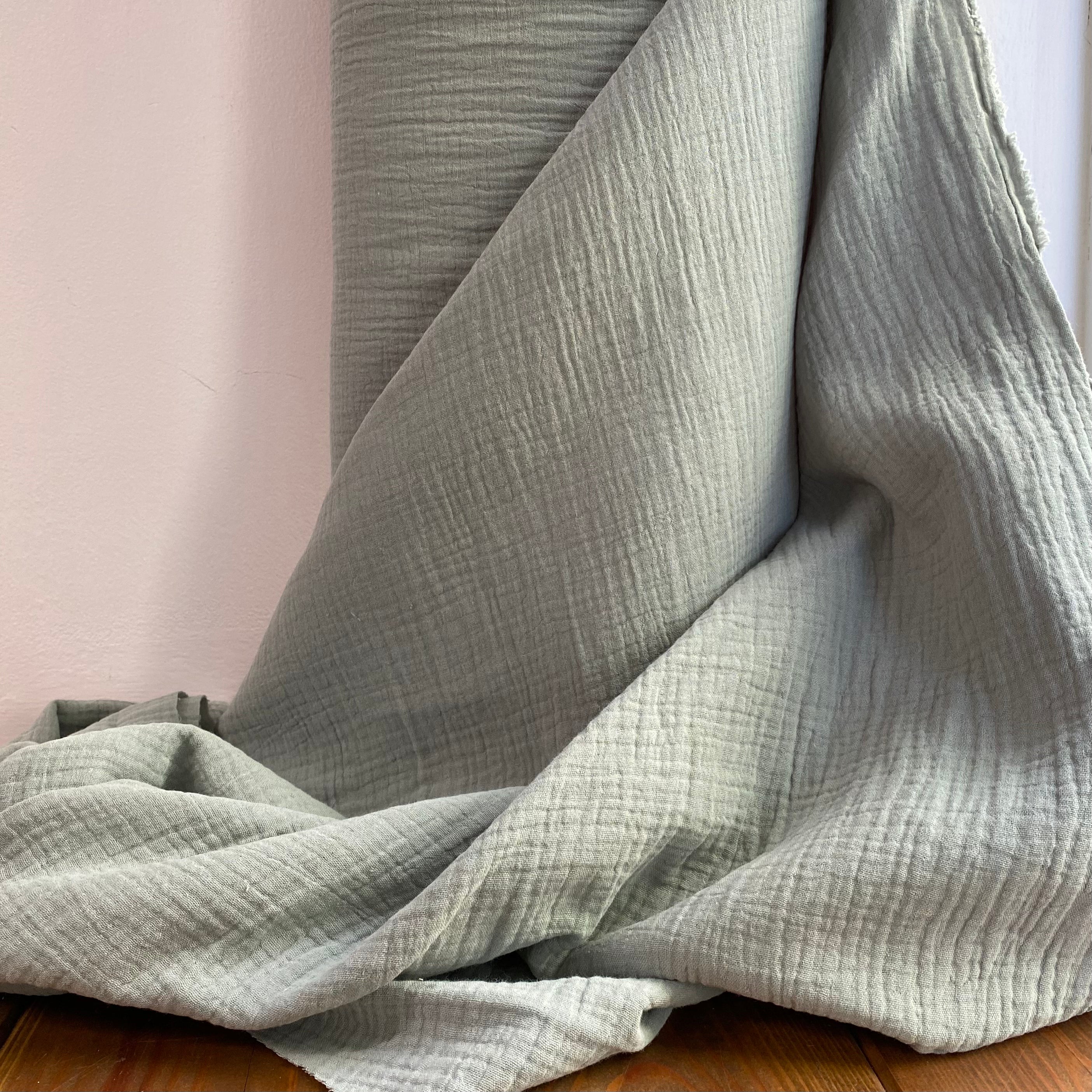 This double gauze fabric is made from 100% cotton and features two thin layers of loosely woven material that are lightly stitched together. It has a soft feel and a natural, slightly crinkled texture that makes it breathable and comfortable to wear.