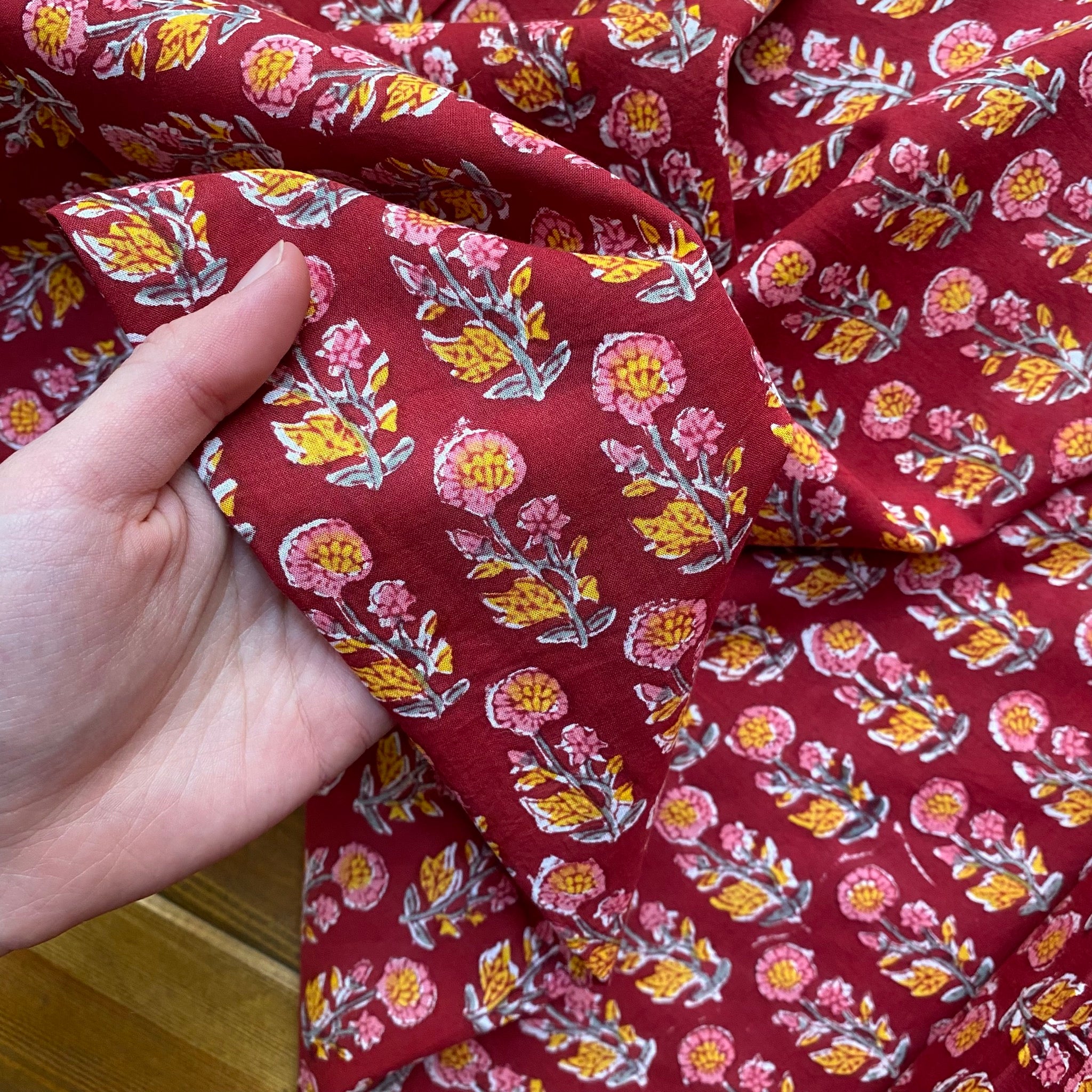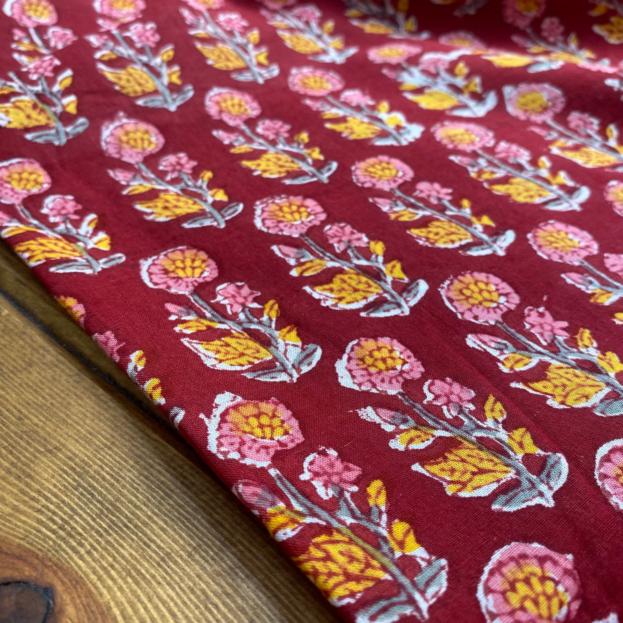 This fabric is printed by skilled artisans using hand-carved wooden blocks, giving each design its own unique character. The traditional block printing technique brings out detailed floral patterns that feel fresh, natural, and easy to wear.