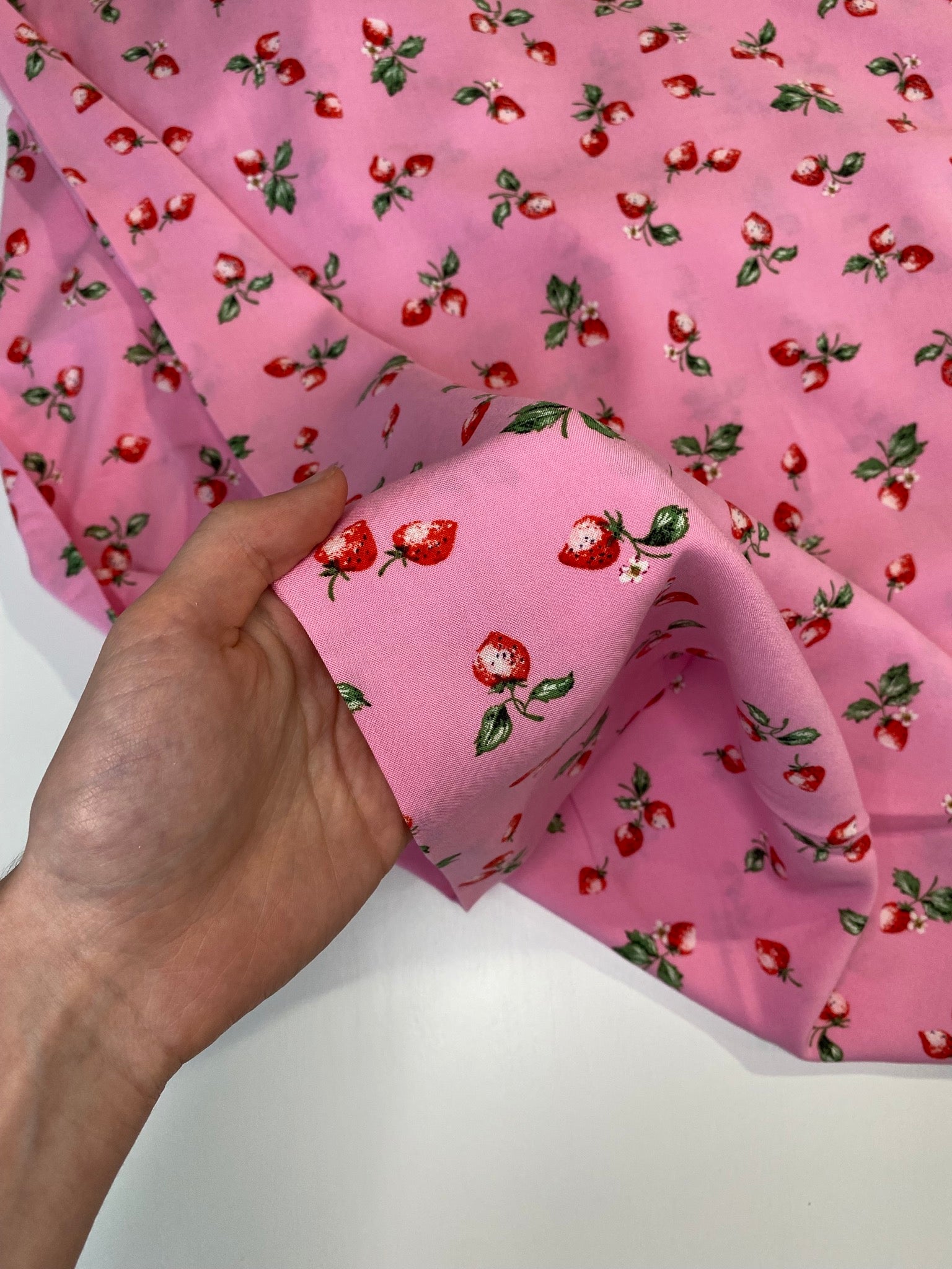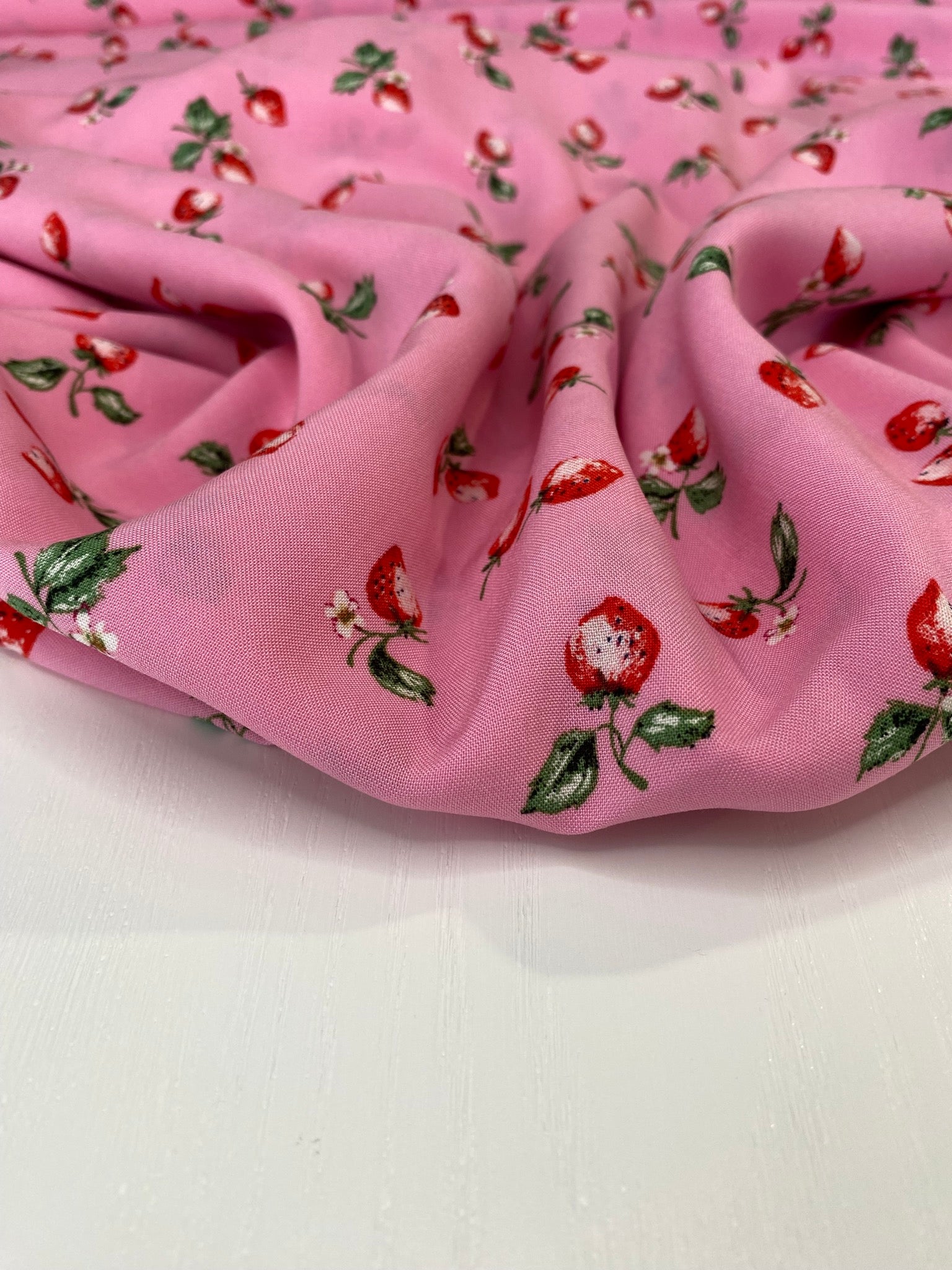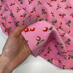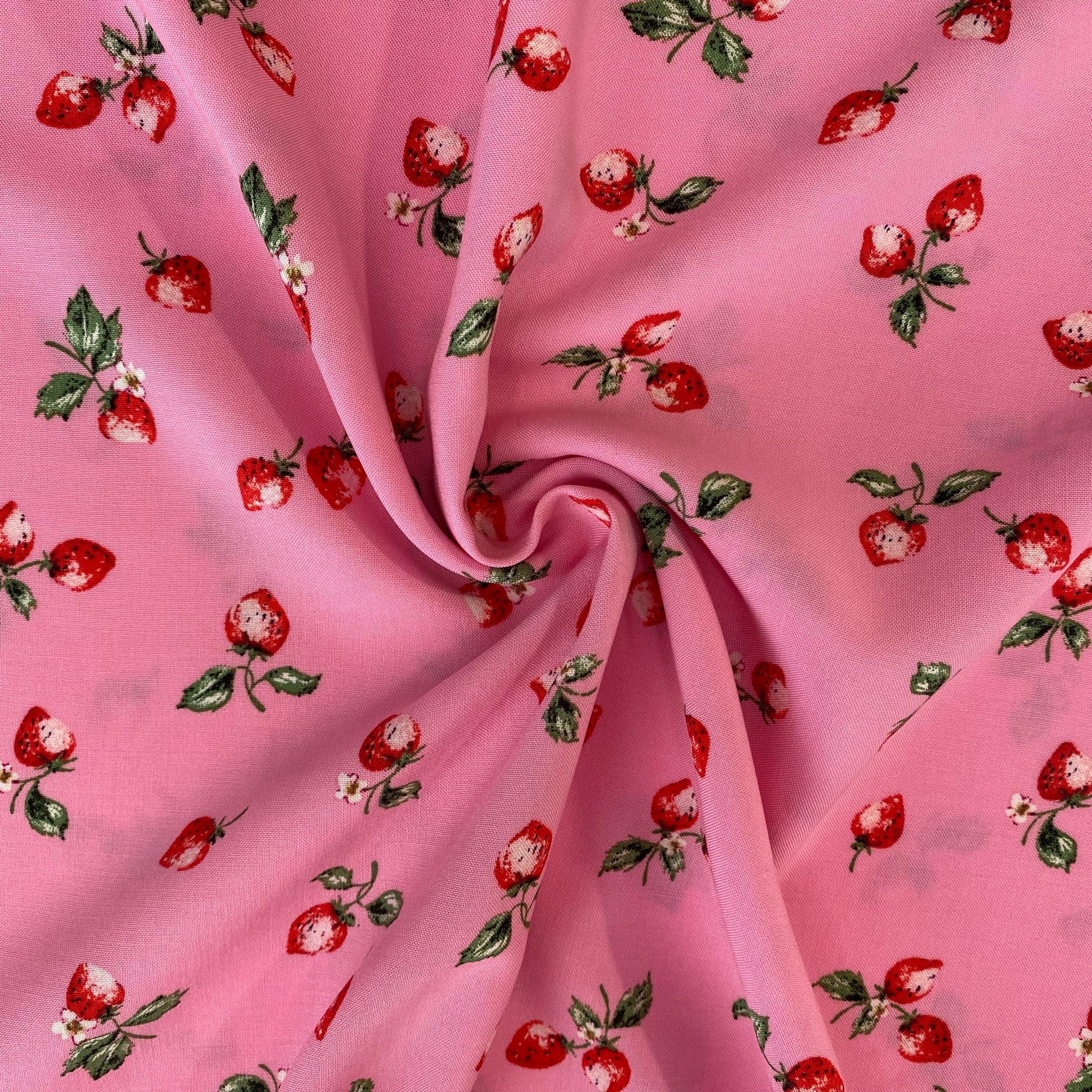 Strawberries for summer is the ideal floaty viscose fabric for the warmer weather, it has a delicious fruity design on a barbie pink base!