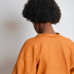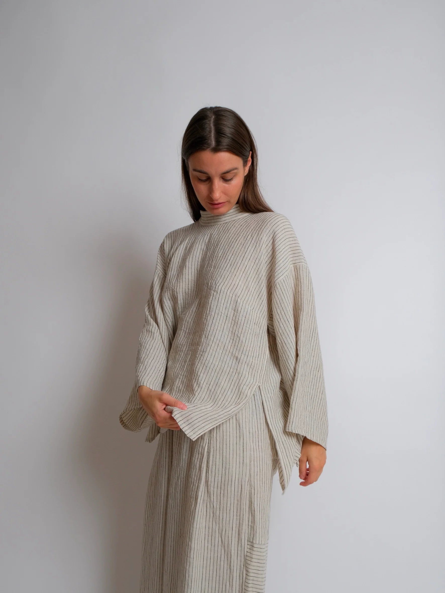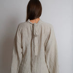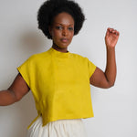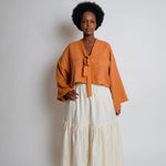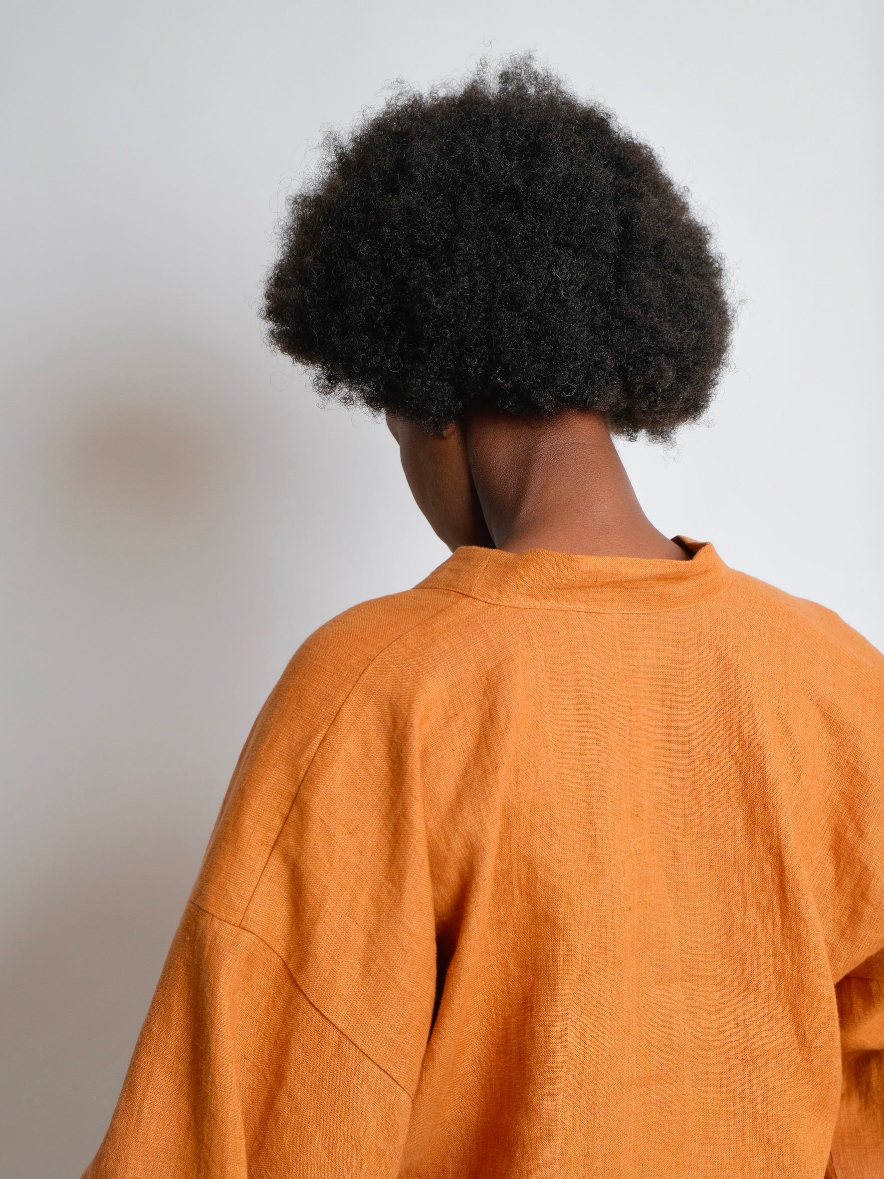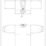 The Zero Waste (ZW) Tie Top is an oversized shape with a relaxed fit and comes with a high neck and low neck option as well as 3 different garment lengths. This top features an attached neck band which turns into a tie that can be positioned at the front or back neck, as well as additional instructions on how to add side splits and adding gathers and a cuff to the sleeves.