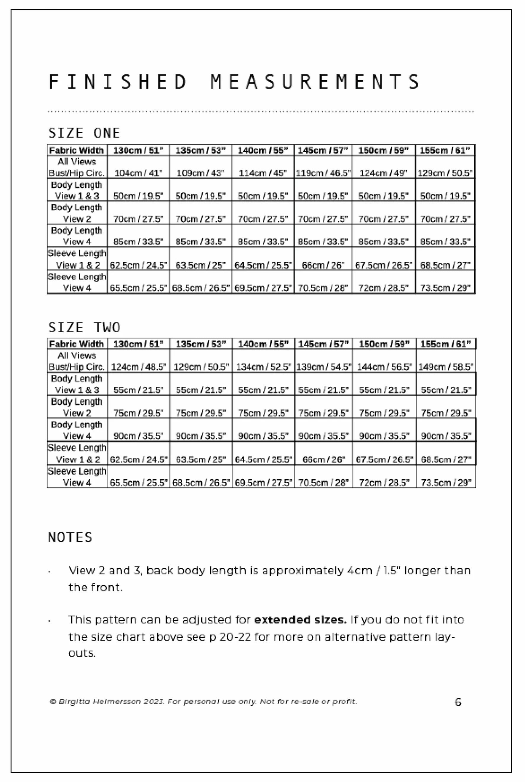 The finished width of this garment is determined by the fabric width you use. There are 2 size options for this top, a size ONE and TWO with a maximum hip size of 125cm / 53". The pattern also includes additional instructions to size up further to a 155cm / 61" hip.